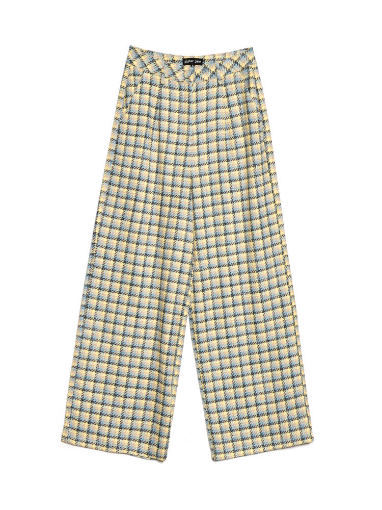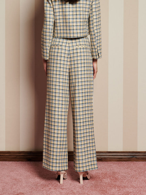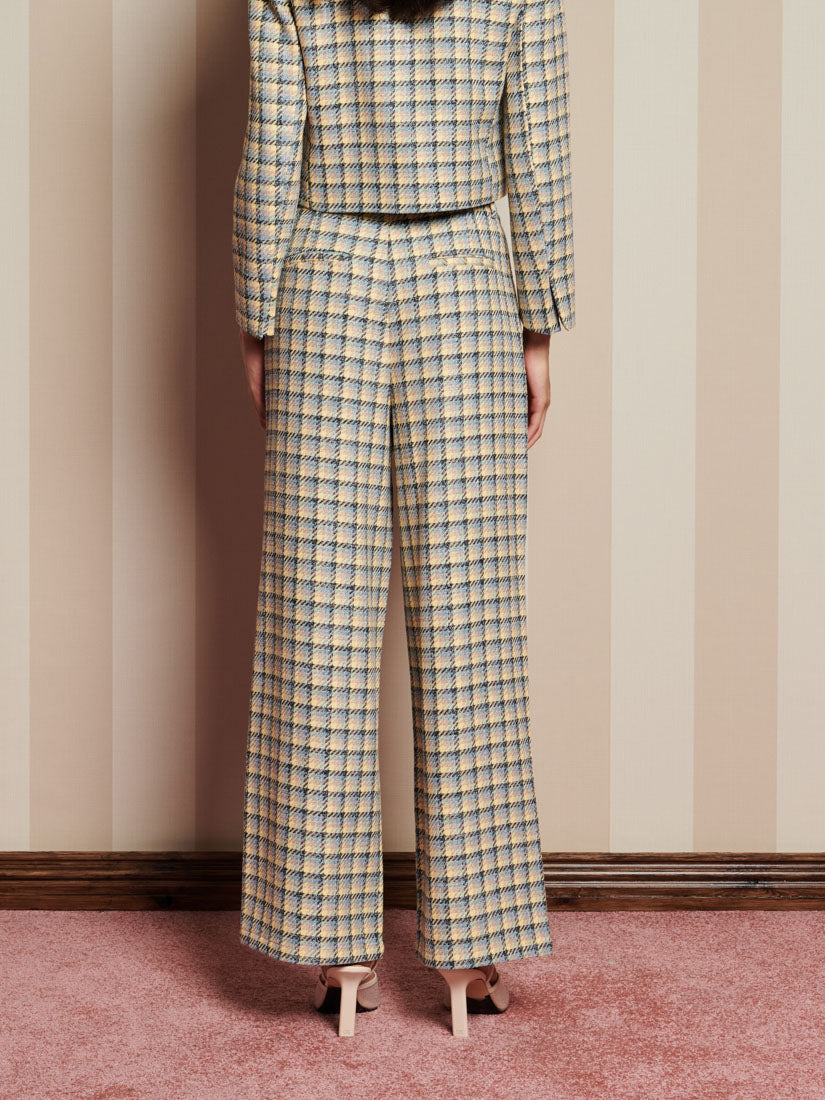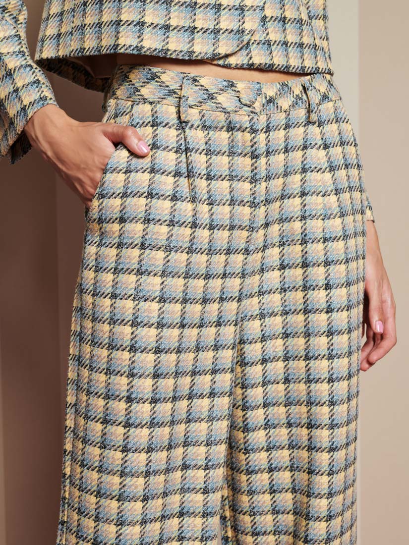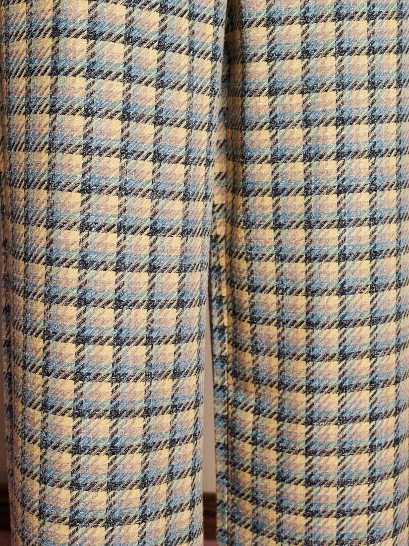 チェック柄の織物を使用したハイウエストパンツ。ベルトループ、サイドポケット、バックのウェルトポケットが特徴。