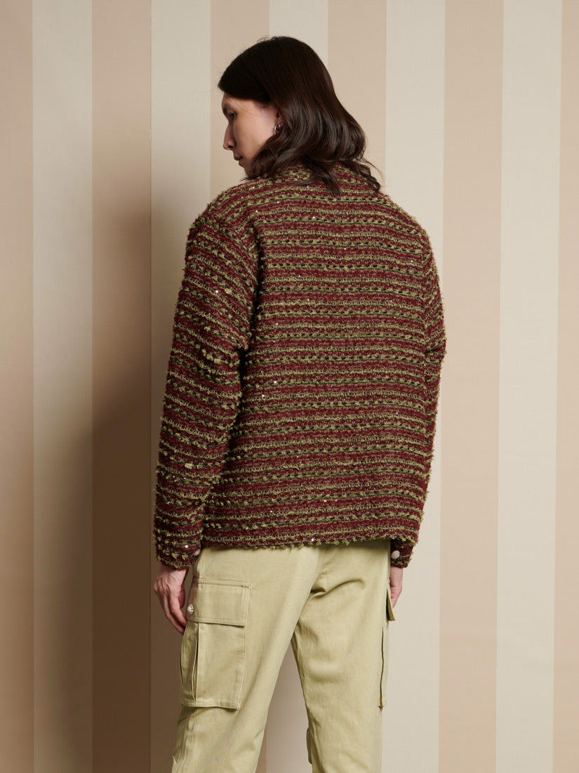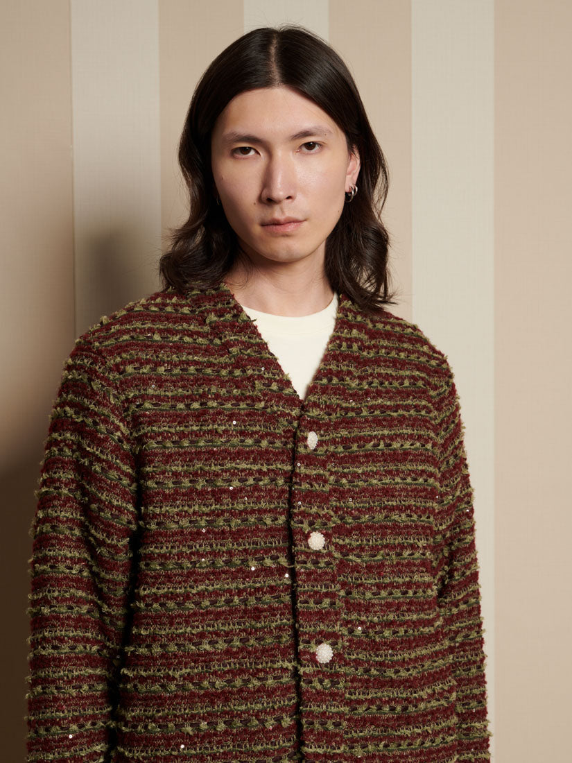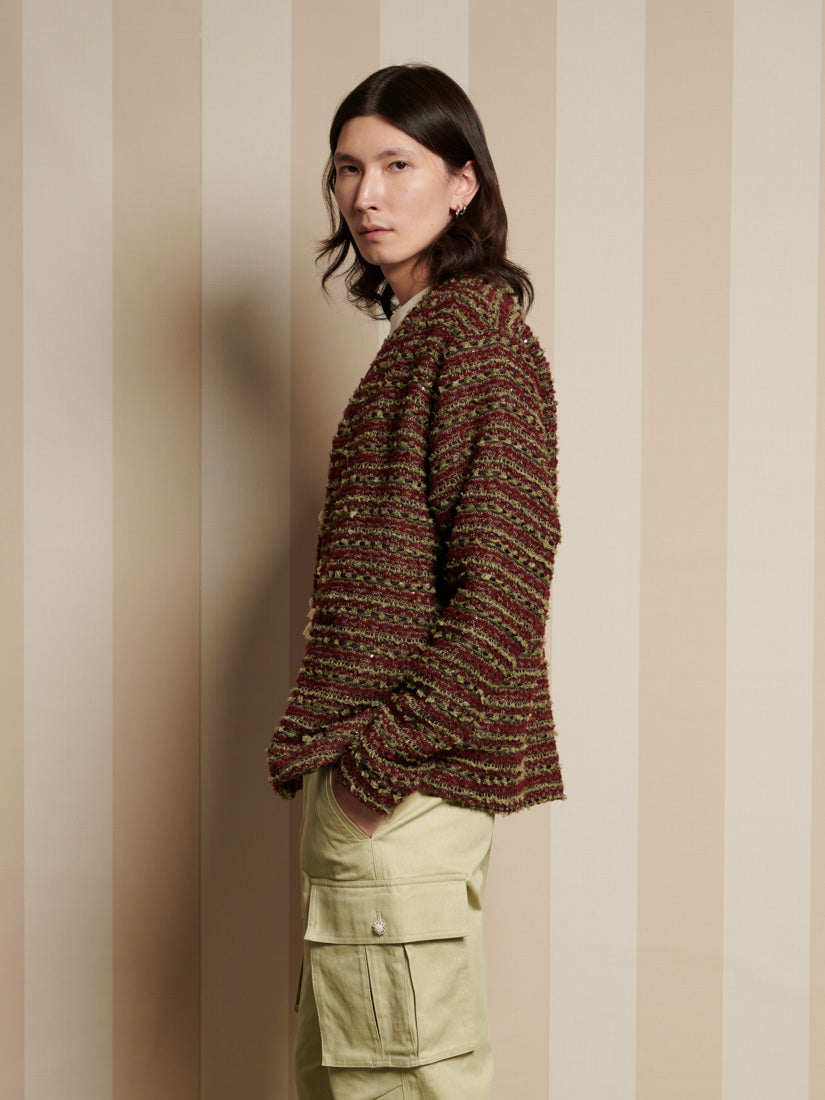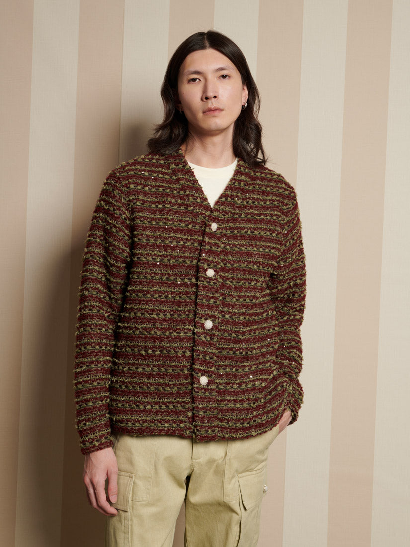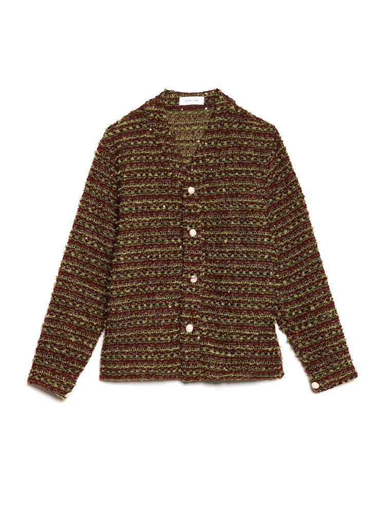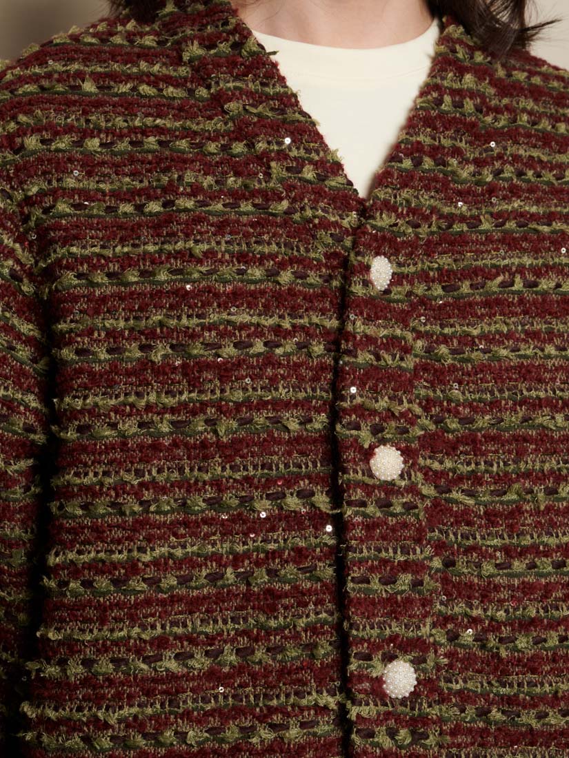 テクスチャーのある織りのツイード生地を使用したレギュラーフィットカーディガン。同生地のネックバンド、サイドポケット、パールボタン留めが特徴。サイズにより胸囲は52.5~65cm。