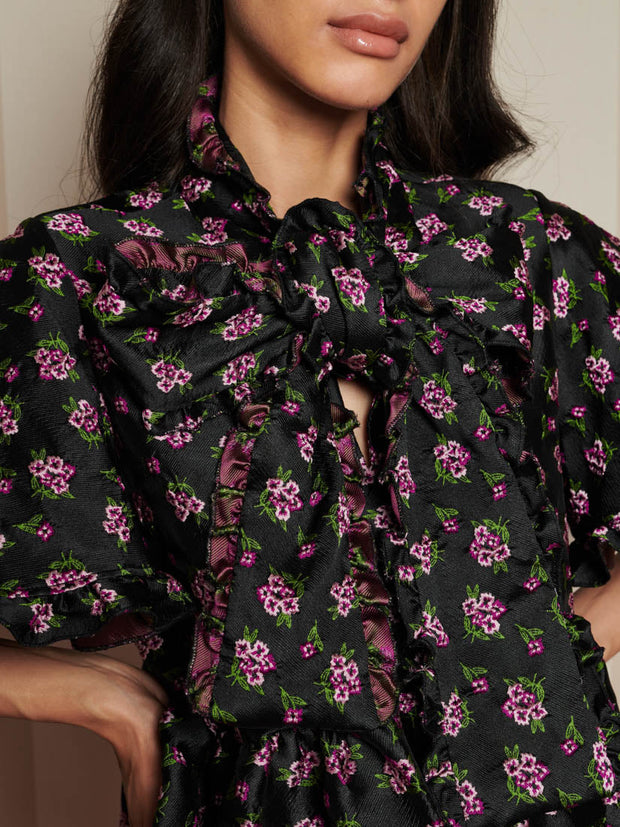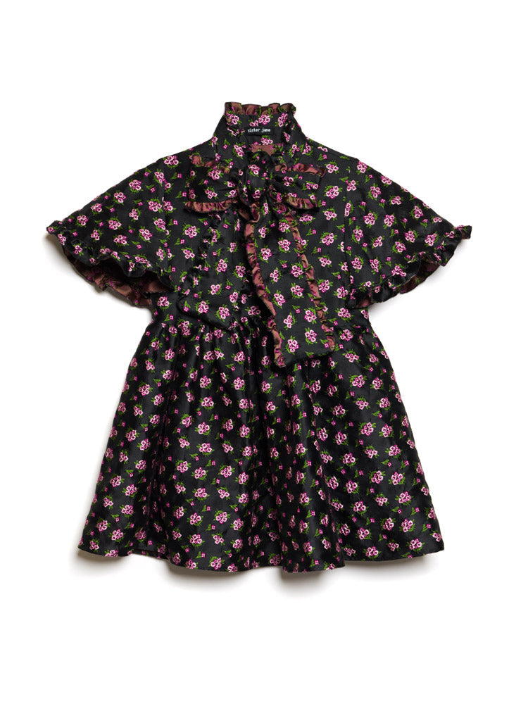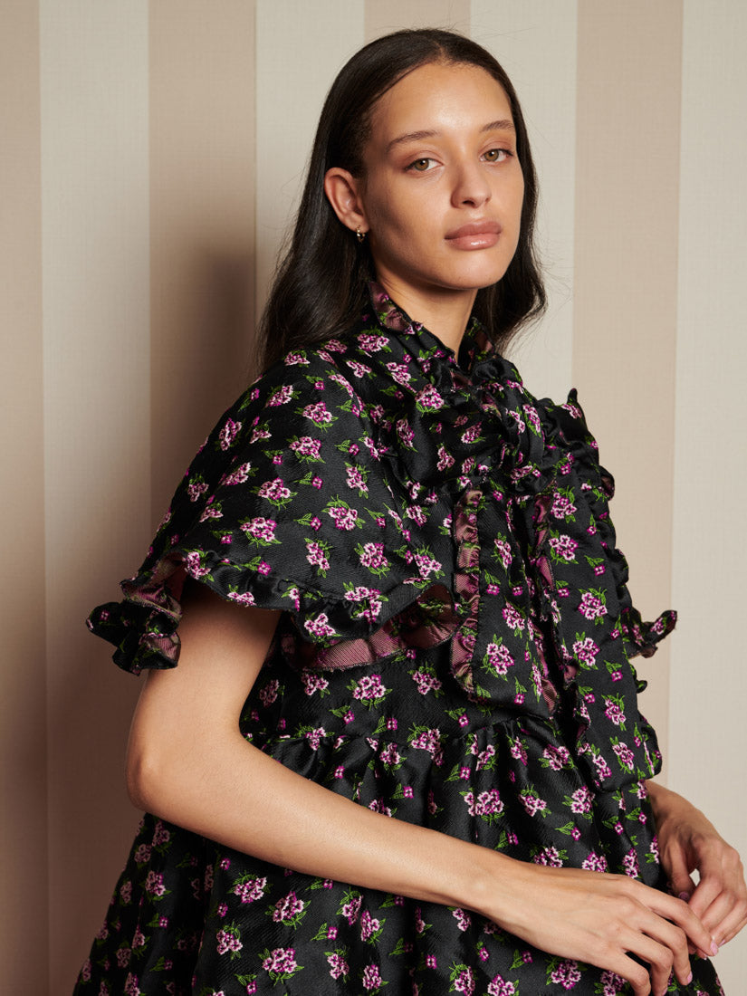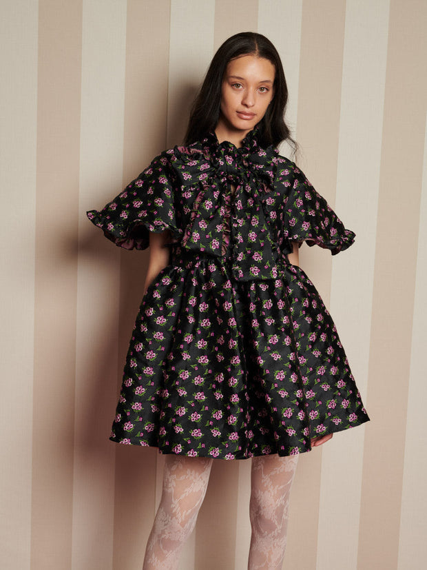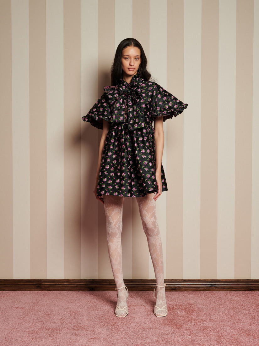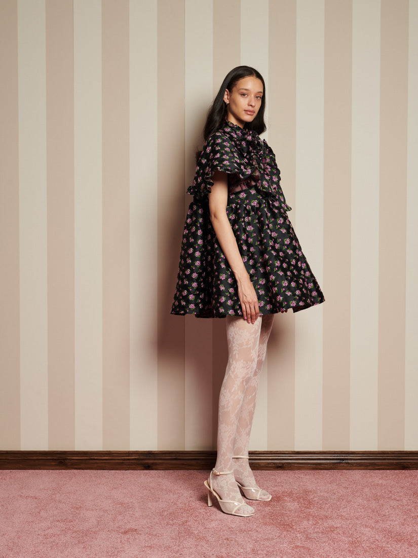 Canopy Jacquard ミニワンピースは、まさに主役の一着——フリルのような花柄が魅力的で、まるで家全体があなたのために着飾ったかのような、魅惑的な魅力に包まれています。