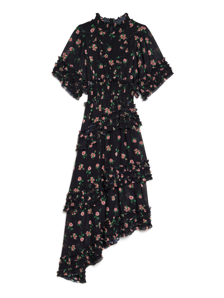 ミディ丈のドレス。繊細な花柄シフォン生地を使用。ウエストとネックラインにはゴム入りシャーリング加工を施し、マルチティアードスカートとアシンメトリーな裾が特徴。ドレスの丈はサイズにより147~153cm。