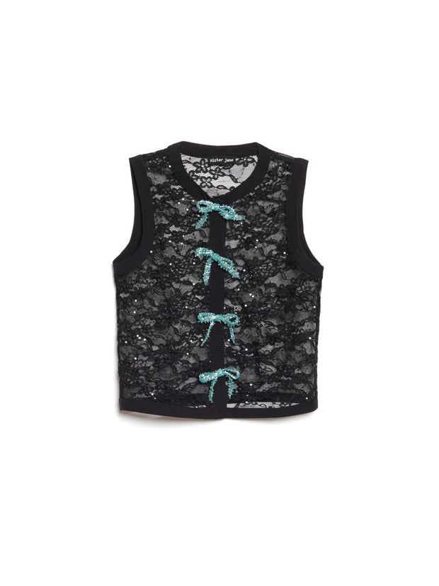 スパンコールをあしらったレース生地のクロップドベストトップ。コントラストの効いたビーズのボウトリムで装飾され、前面に隠しスナップボタン留めを採用。