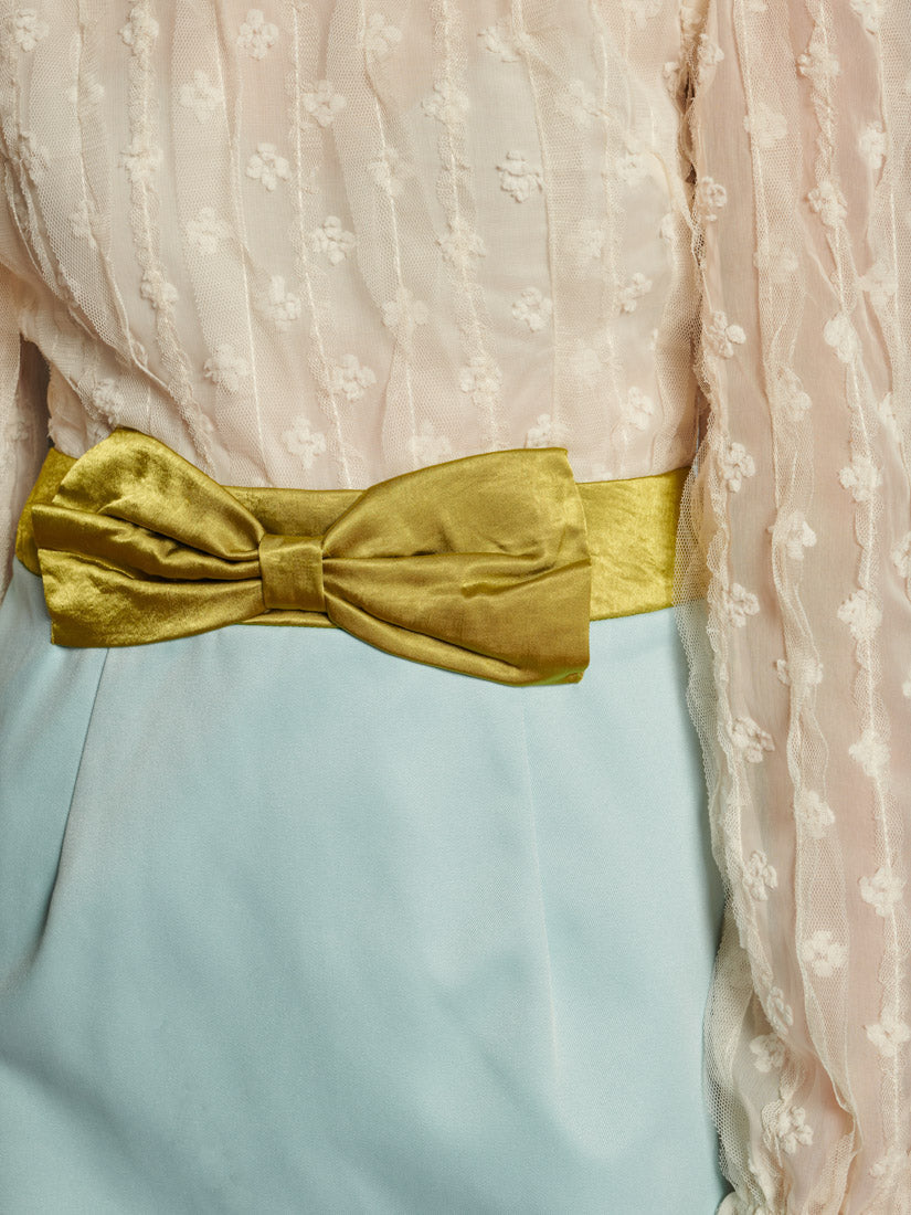 混合素材のミニ丈ドレス。ボディと袖にはテクスチャーのあるシフォン生地を使用し、緑のサテンリボンと青のサテンスカートがアクセント。ドレス丈はサイズにより83.5~89.5cm。