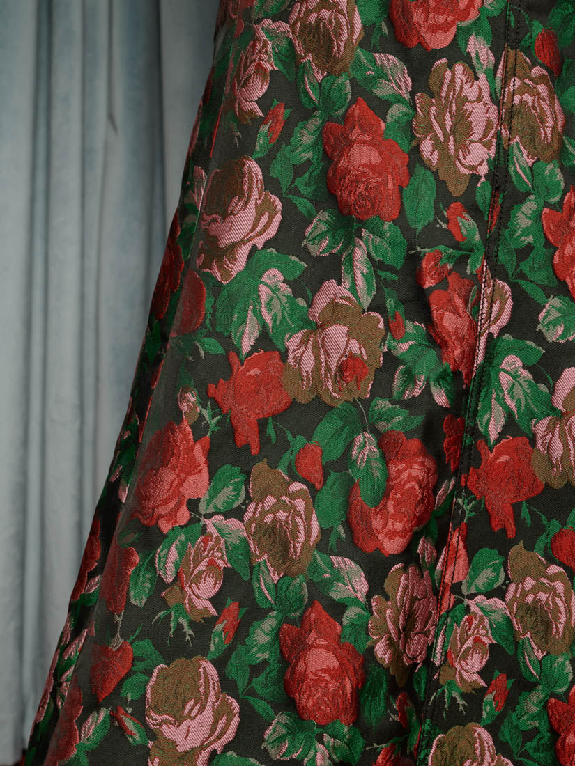 花柄ジャカード生地のフィットスカート。型紙に沿った縫い目とトップステッチのディテールを施したフルライニング仕様。