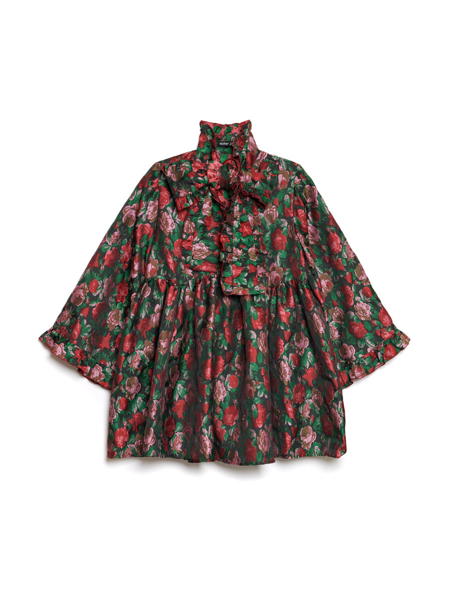 ルーズフィットのミニドレス。花柄ジャカード生地を使用。フルライニング仕様で、シェイプドウエストの縫い目とサイドポケットが特徴。調節可能な一体型ネクタイがフリルエッジで仕上げられています。ドレスの長さはサイズにより84~90cmです。
