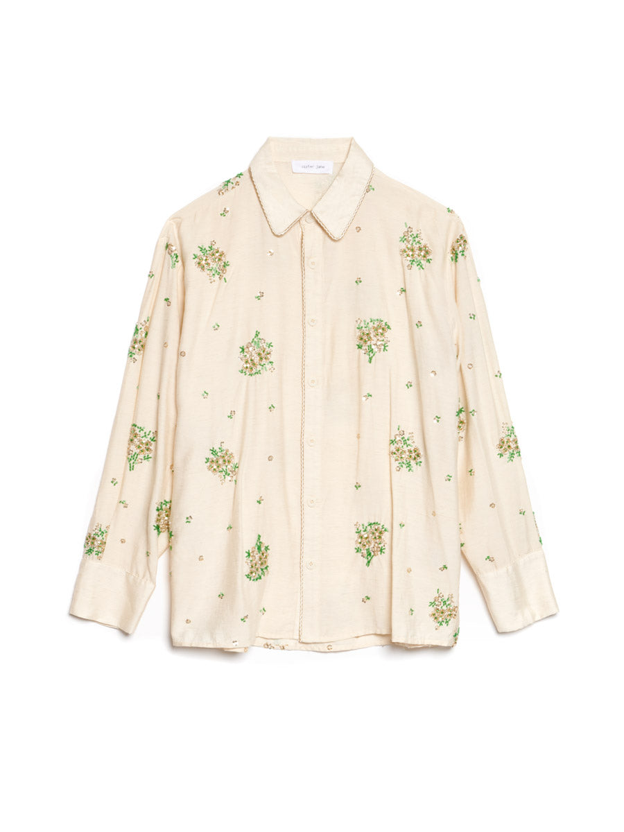 リラックスフィットのシャツ。天然素材の織物地にビーズとスパンコールの花柄モチーフをあしらったデザイン。襟元、前立て、袖口にはパイピング仕上げを施し、同系色のシャツボタンで留める仕様。胸囲はサイズにより55~67.5cm。