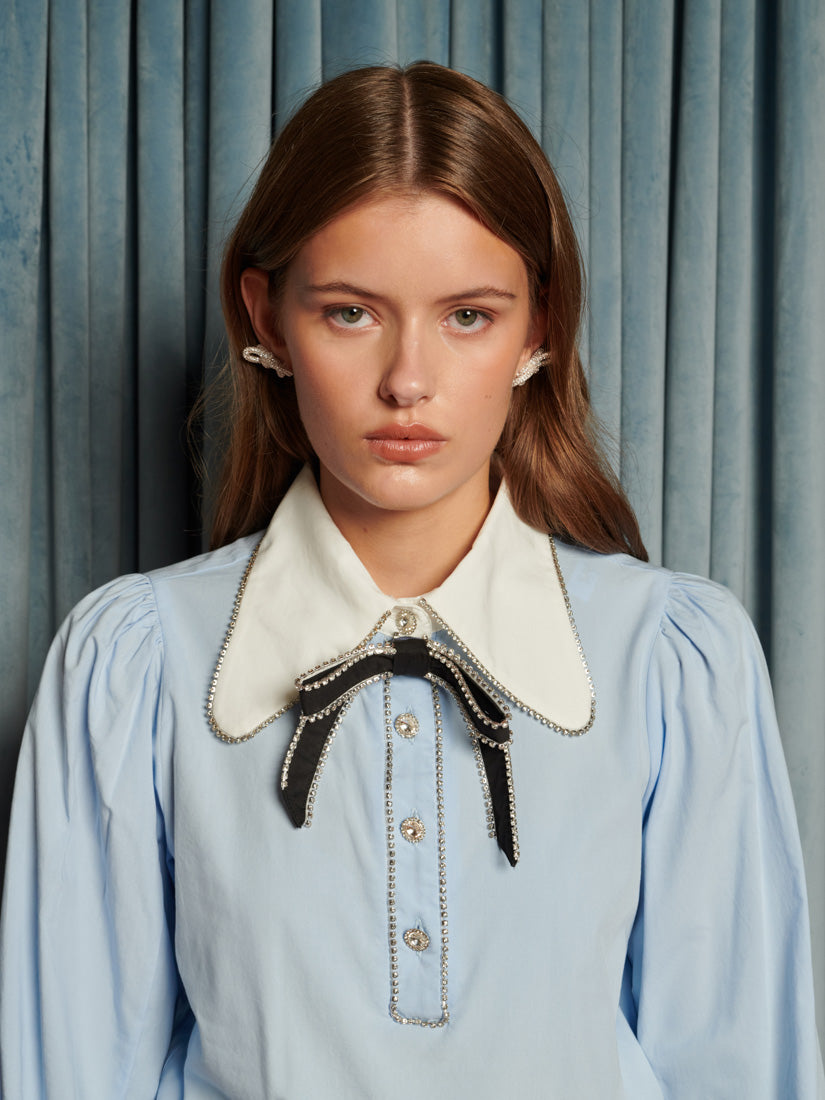ソフトな織物を使用したレギュラーフィットのブラウス。コントラストカラーの襟と袖口、宝石調のトリムが特徴。四分丈のボタンスタンドに宝石調ボタンで留める仕様。