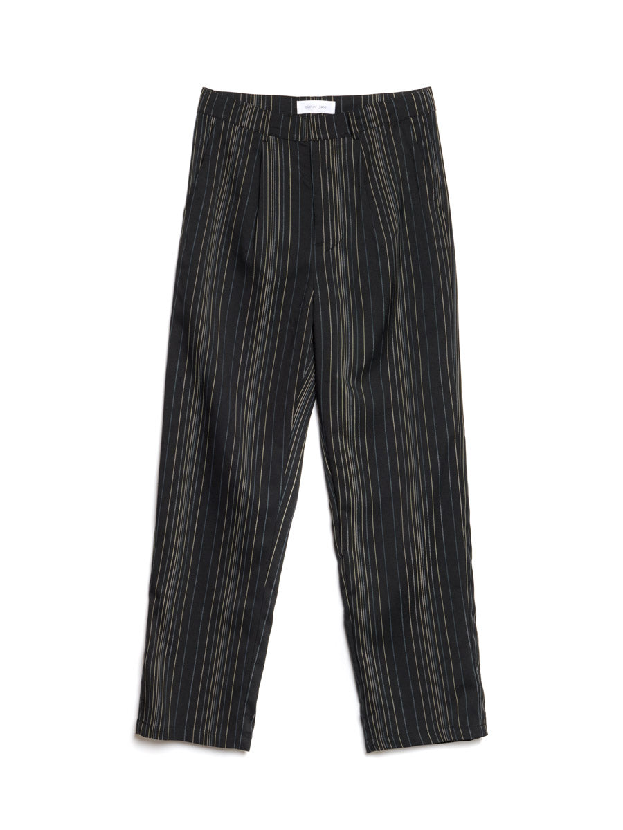 ストライプ柄の織物を使用したテーラードパンツ。サイドポケットとバックウェルトポケット付き。ベルトループと隠しフック&バー留め具が特徴。