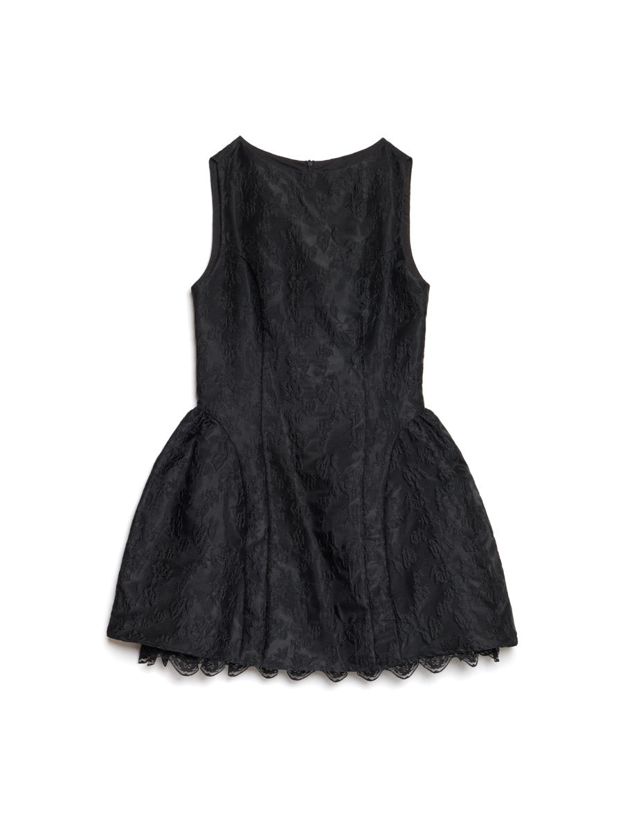 花柄ジャカード生地のミニ丈ドレス。サイドギャザーとレースのアンダーレイヤーが特徴のノースリーブデザイン。フルライニング仕様。ドレス丈はサイズにより83~89cm。