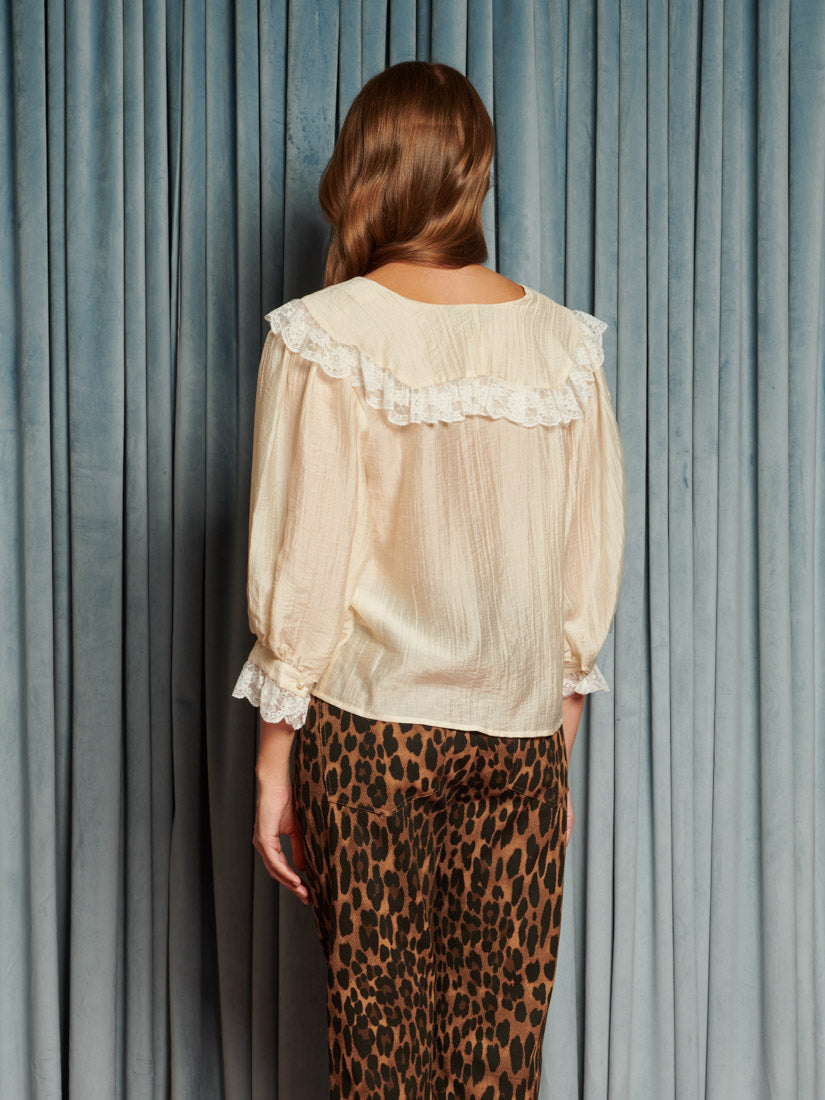 軽やかな織物素材のゆったりとしたブラウス。セーラーカラーとトーンを合わせたレースの縁取りが特徴。真珠ボタンで留める仕様。