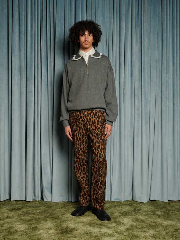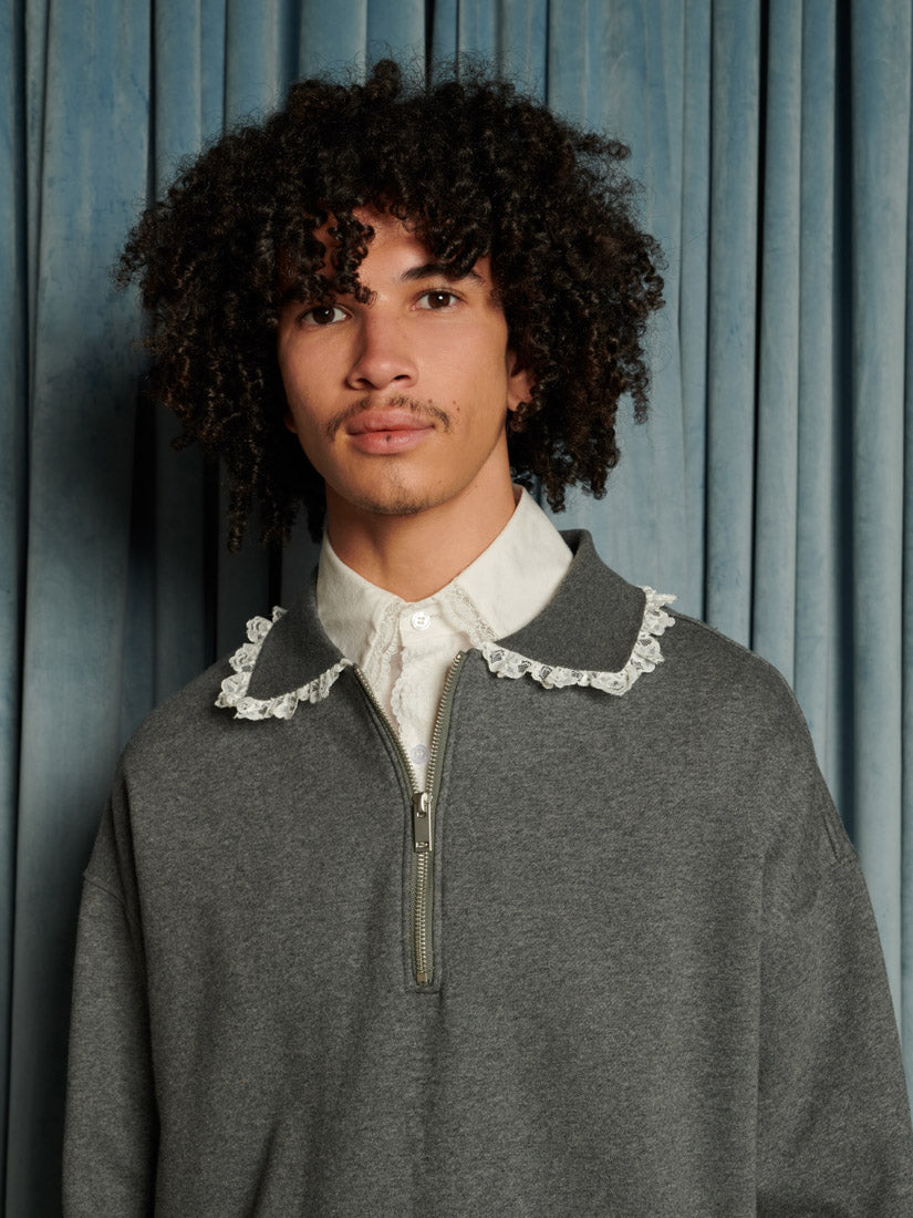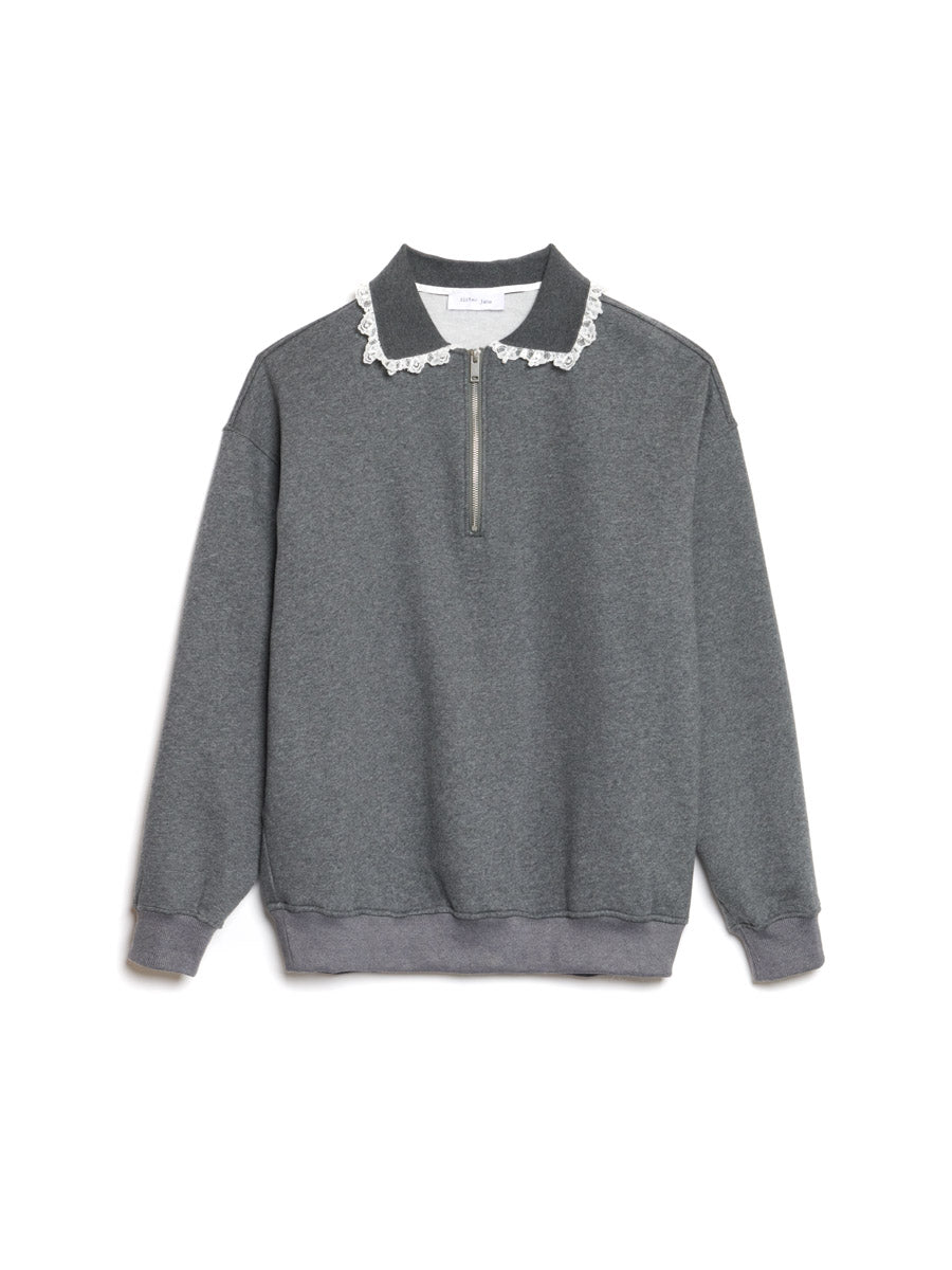 レギュラーフィットのロングスリーブスウェットシャツ。中厚のジャージー素材を使用。クォータージップスタイルで、袖口とウエストバンドはリブ仕様。襟元にはレースのトリムが施されています。