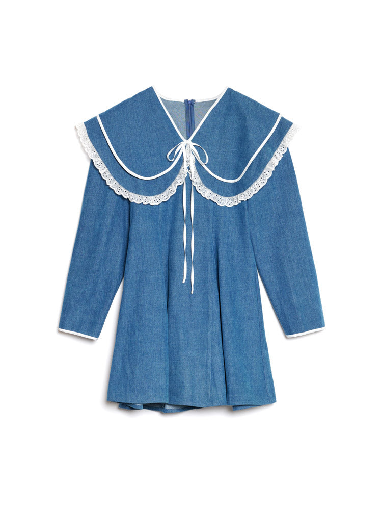 ミッドブルーのウォッシュ加工デニム生地を使用したミニドレス。フィット&フレアシルエットで、コントラストの効いた縁取りとフリルレースのトリムをあしらった印象的なダブルカラーが特徴。ネックラインのリボンと隠しファスナーで留める仕様。ドレスの丈はサイズにより85.5~91.5cm。