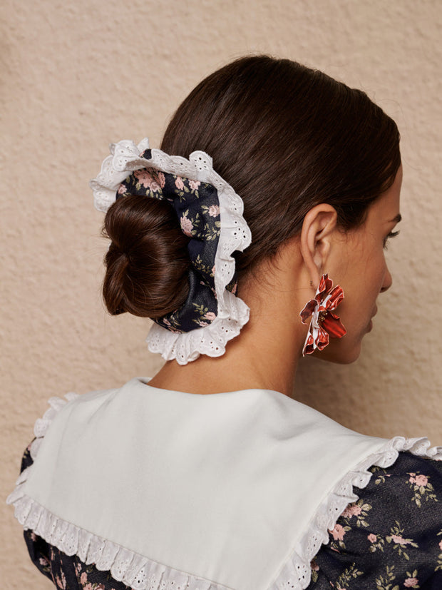 ドレスと同じフローラルのディツィージャカード生地で仕立てたEclipse Ditsy シュシュは、ギャザー入りのブロデリー・アングレーズトリムで仕上げられ、髪を揺らすたびに小さな喜びを添えます。