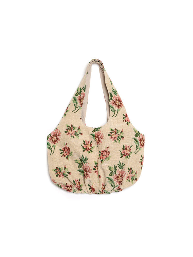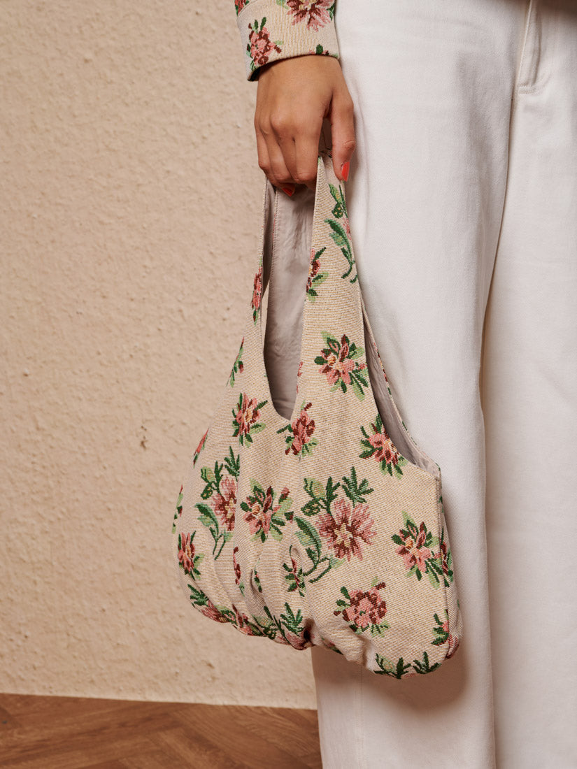 花柄タペストリー生地のグラブバッグ。内側全面裏地付き、ギャザー加工の底、マグネットスナップ留め。