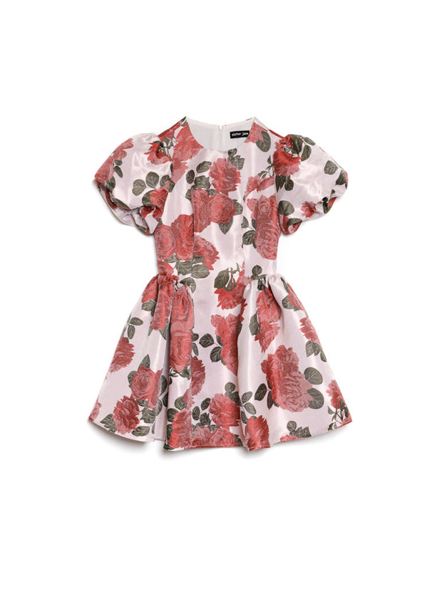 花柄ジャカード生地のミニドレス。プリンセスラインとギャザースカートが特徴のフルライニング仕様。隠しファスナーで留めるデザイン。ドレスの長さはサイズにより85~91cm。