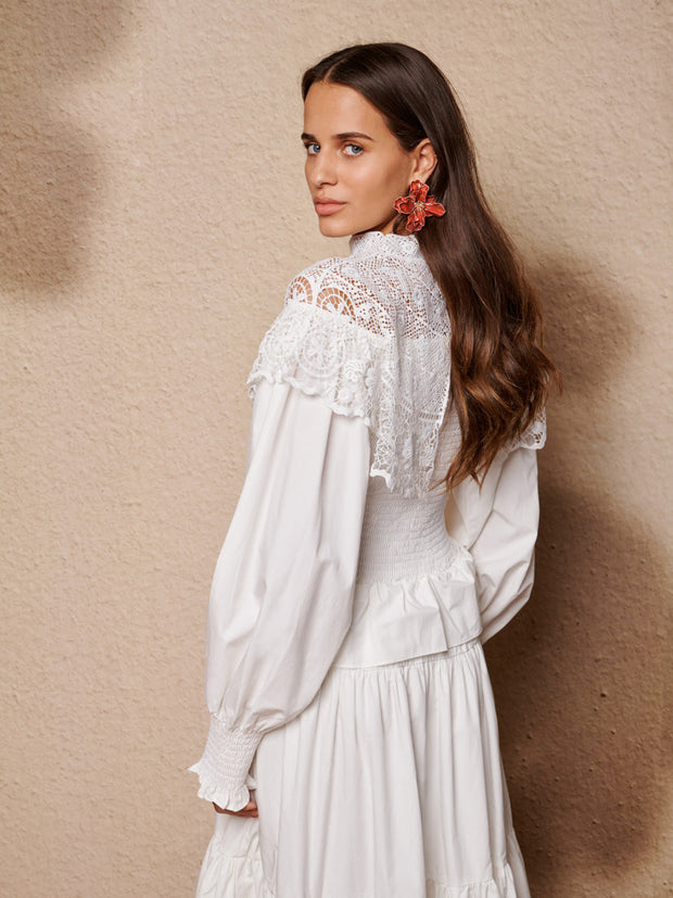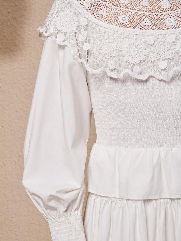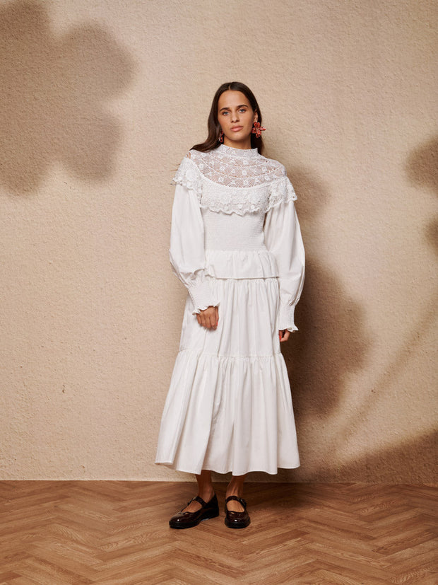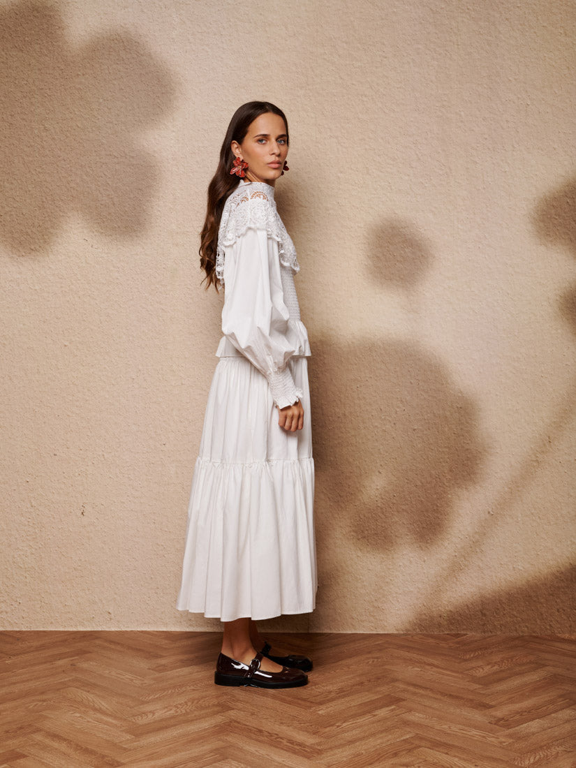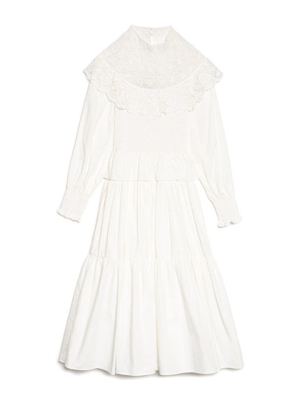 綿のような風合いのマキシドレス。シャーリング加工のボディスと袖口、たっぷりとギャザーを寄せたティアードスカートが特徴。印象的な刺繍入りケープカラーと深いウエストフリルがアクセント。ドレスの長さはサイズにより132~138cm。