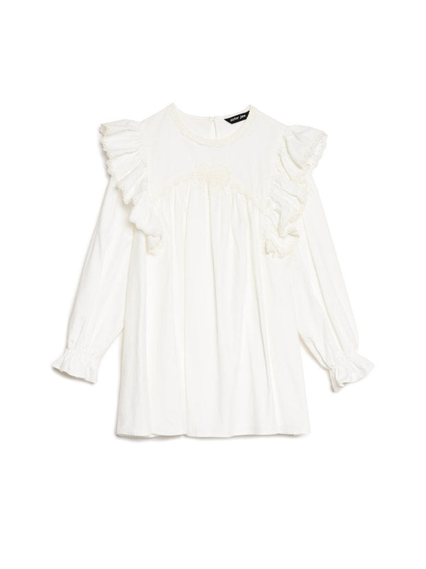 コットン調素材のミニドレス。ゆったりとしたシルエットに、ギャザーを施したカーブしたヨーク縫い目と印象的なフリルが特徴。コットンのトリムとハートのアップリケでディテールを添えています。背面にカバーボタンで留める仕様。ドレスの長さはサイズにより84~90cmです。