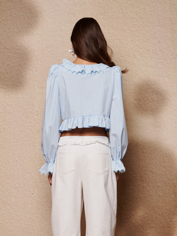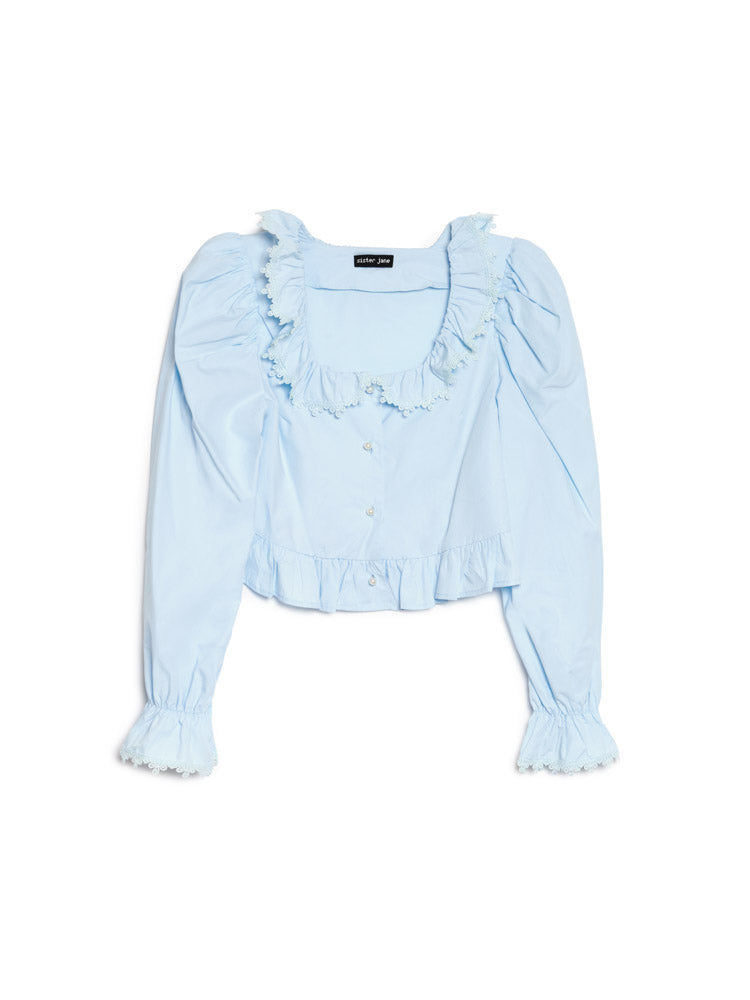 コットン調素材のクロップトップ。スクエアネックラインにフリルディテールを施し、コットン素材のトリムで仕上げ。SJのパールボタンで留める仕様。