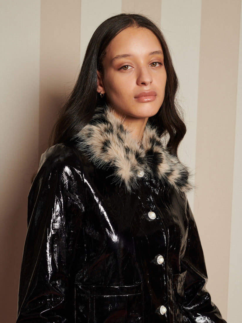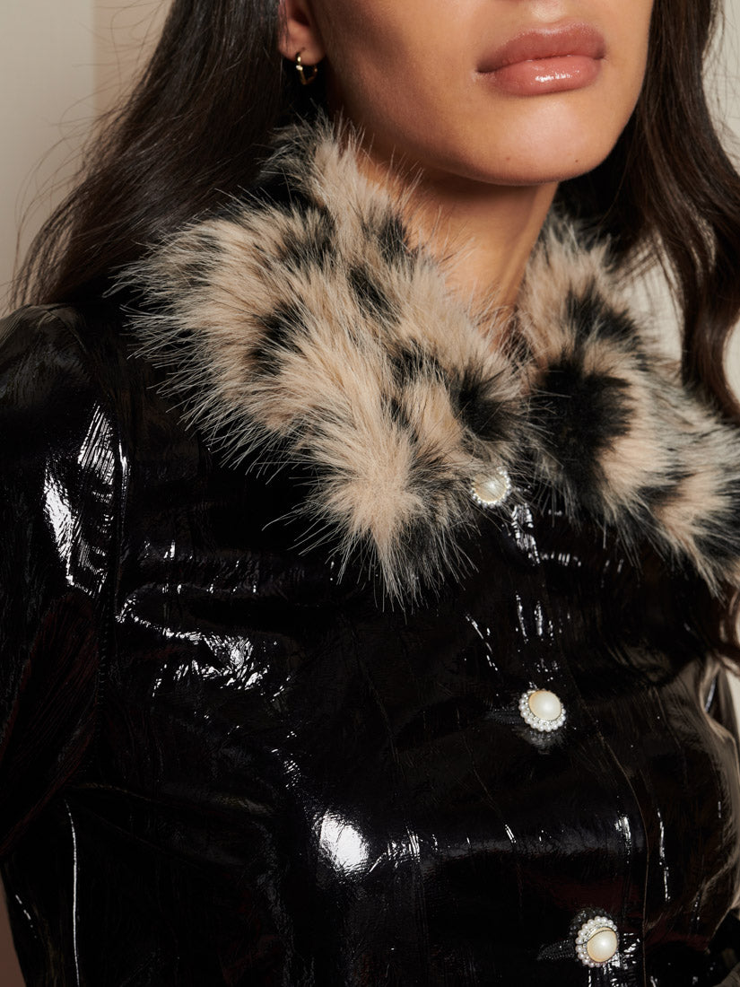 光沢のある仕上げとレオパード柄のフェイクファーが融合したLunette PU ジャケットは、古き良き家族のグラマラスな雰囲気と現代的な遊び心をミックスしたような一着です。