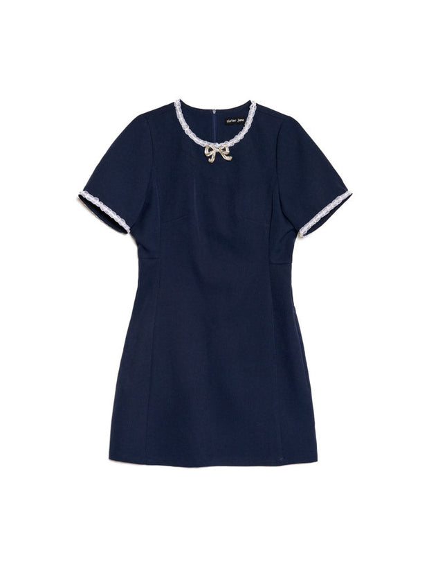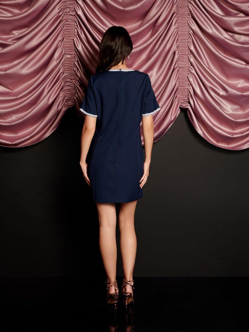 柔らかな織物素材のミニ丈ドレス。ネックラインと袖口にはオーガンザの宝石風トリムをあしらいました。ネックラインには取り外し可能なシルバーのリボンブローチを添えています。ドレスの丈はサイズにより84~90cmです。