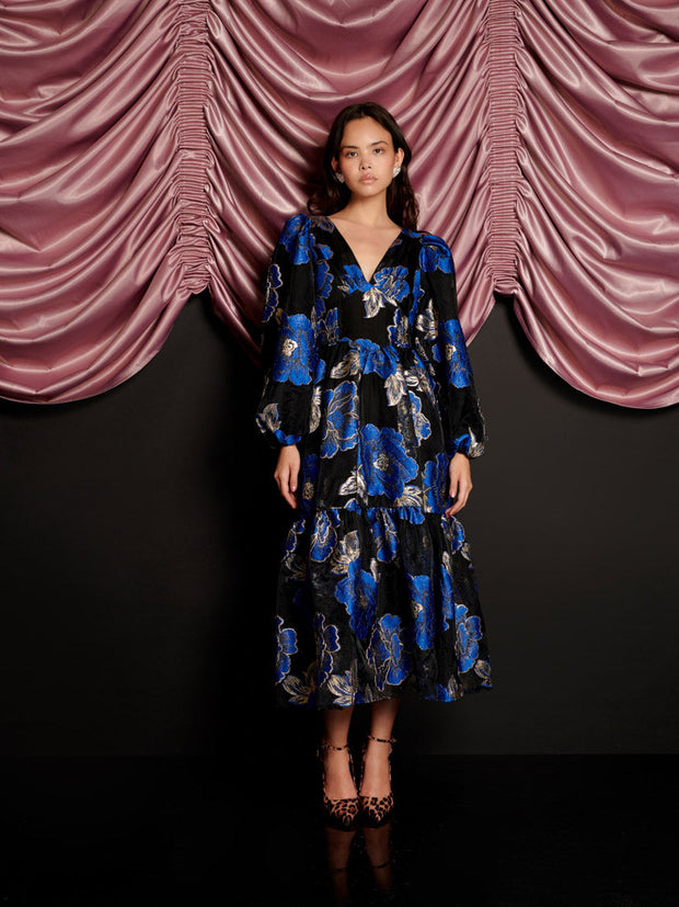 Blues Jacquard ミディワンピースは、花柄ジャカードが奏でる華やかなハーモニー。フィットしたウエストとティアードスカートが美しいシルエットを描き、ロマンティックで輝きに満ちた一着です。優雅さをまとったこのドレスは、スポットライトを浴びるその瞬間を静かに待っています。
