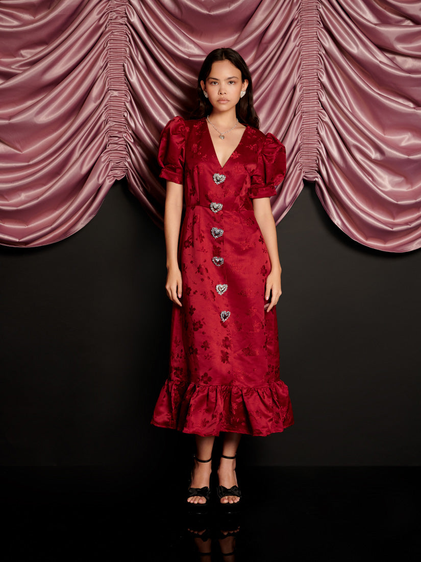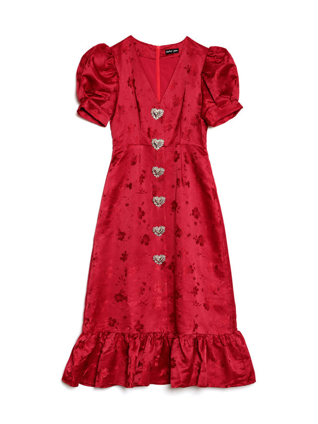 柔らかなジャカード生地のミディ丈ドレス。裏地付きで、装飾的なハート型ボタンがアクセント。ドレス丈はサイズにより121~127cm。