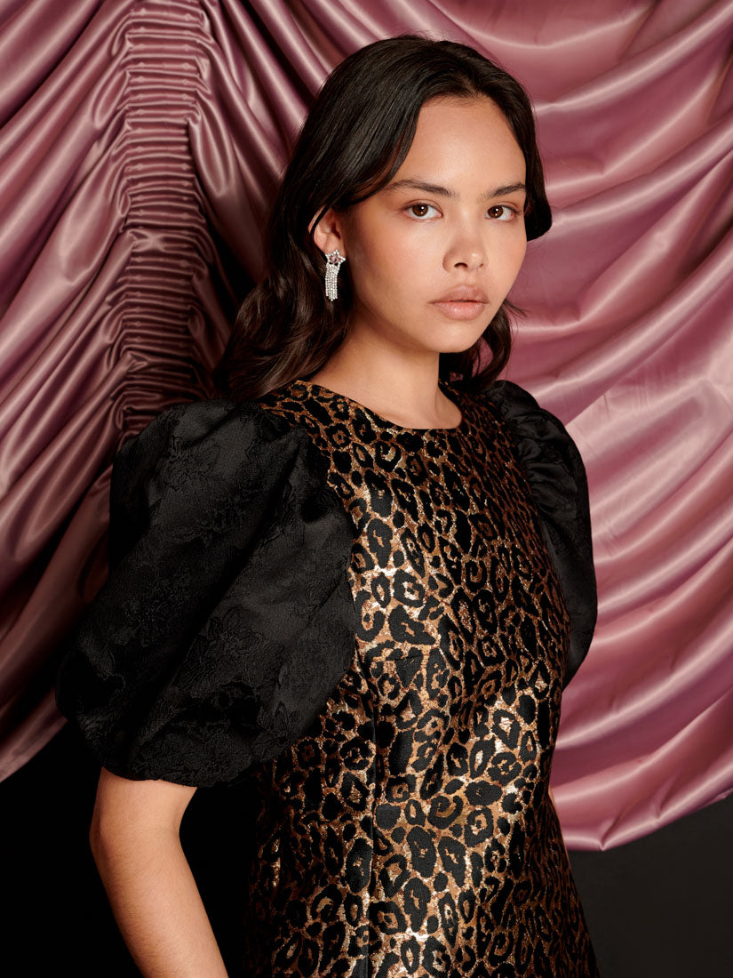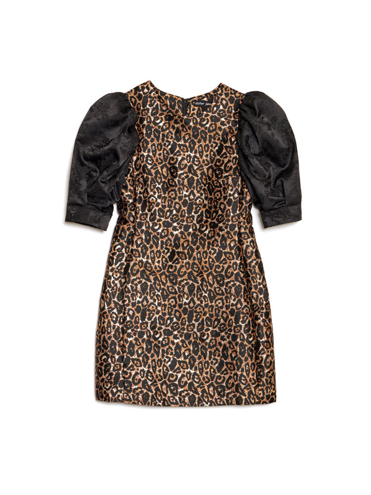 ミニ丈のレオパード柄ジャカード生地のドレス。裏地付きで、コントラストカラーのパフスリーブにカフス付き。ドレスの丈はサイズにより83~89cmです。