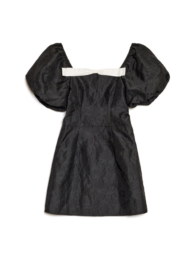 花柄ジャカード生地のミニ丈ドレス。スクエアネックラインと固定されたコントラストカラーのリボントリムが特徴。ドレスの丈はサイズにより84~90cmです。