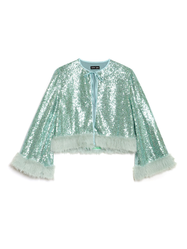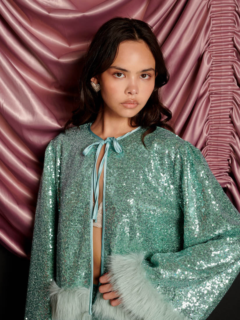 フラットなスパンコール生地のクロップド丈トップス。フルライニング仕様で、裾と袖口にフェイクファーのトリミングを施しています。前面は一体型のネックタイで留めるデザインです。