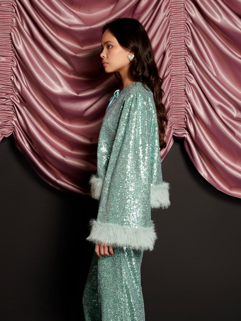 Disco Darling Sequin トップスは、フラットスパンコールとフェイクファーのトリムがきらめく一枚。大きなリボンタイが華やかさを添え、遊び心あふれる贅沢さを表現しています。