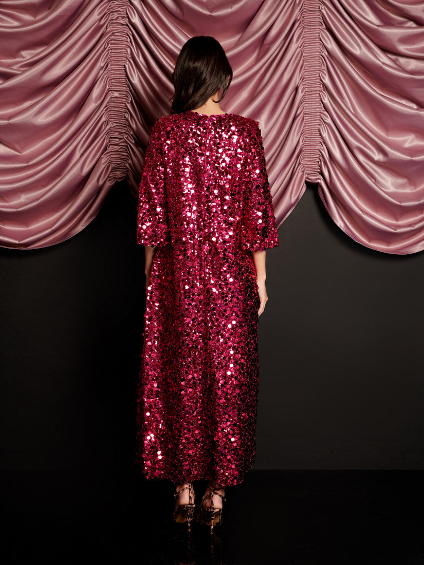 ミディ丈のドレス。スパンコール生地を使用。裏地付きでフレア袖が特徴。ドレス丈はサイズにより129~135cm。