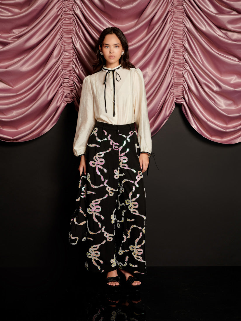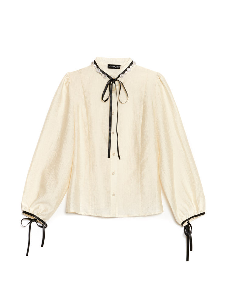 レギュラーフィットのブラウス。テクスチャー感のある織物素材を使用。調節可能なサテンのネクタイと袖口の調節可能なタイが特徴。パールボタンとネックラインのトリムで仕上げ。