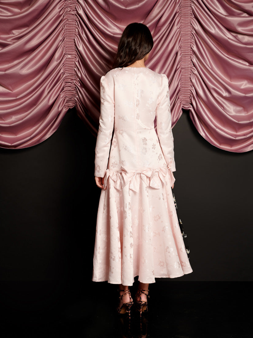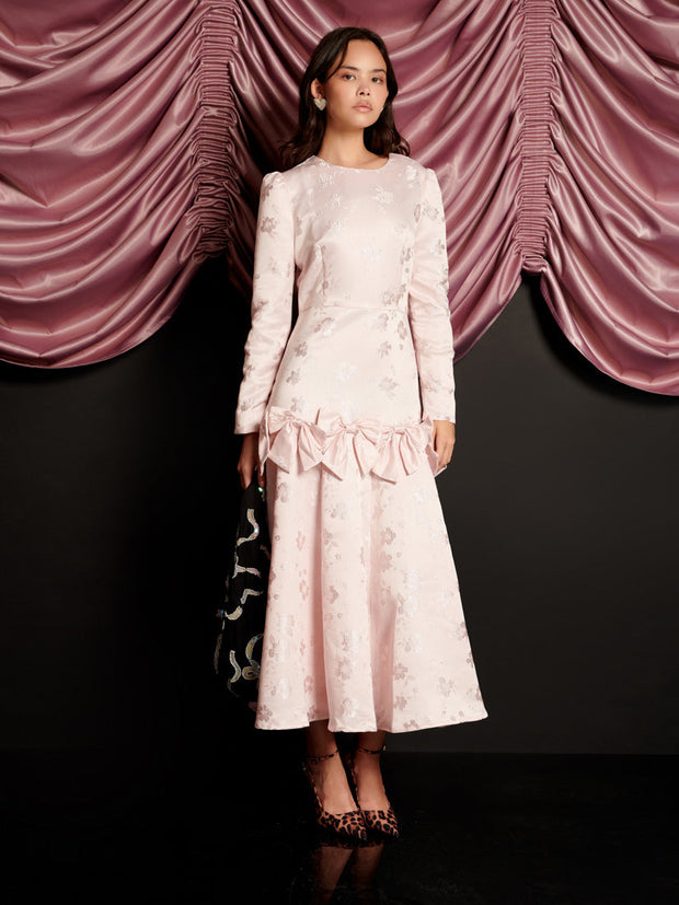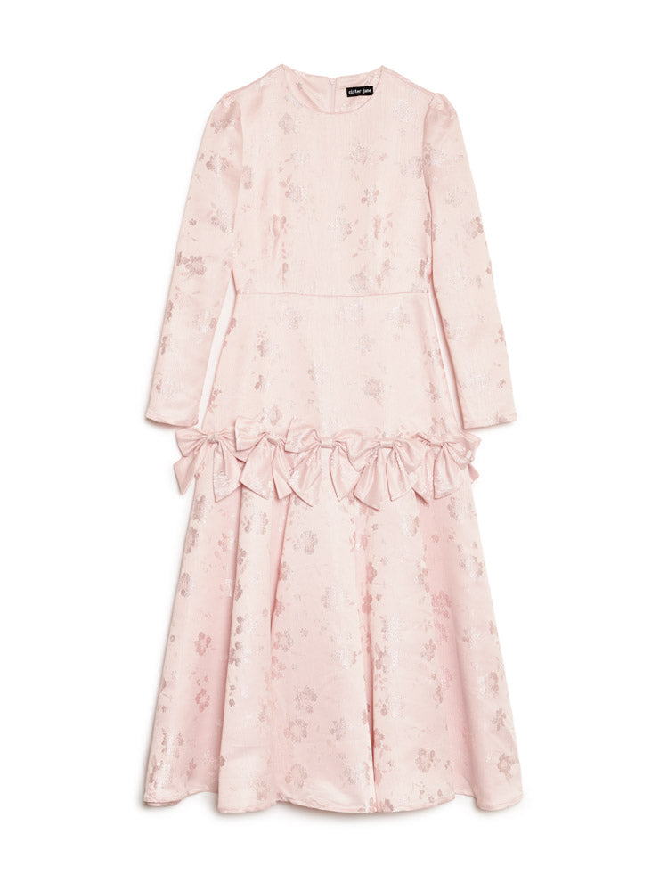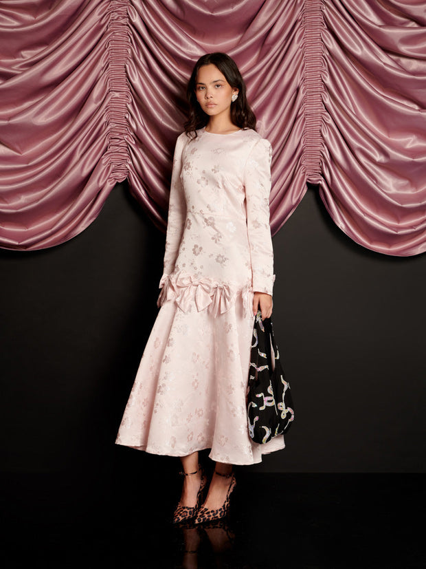 柔らかな花柄ジャカード生地のミディ丈ドレス。ドロップシームのフレアスカートに、縫い目に固定されたリボンをあしらったディテール。ドレスの丈はサイズにより129~135cmです。
