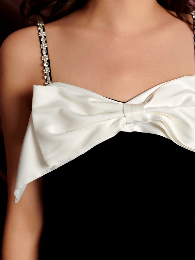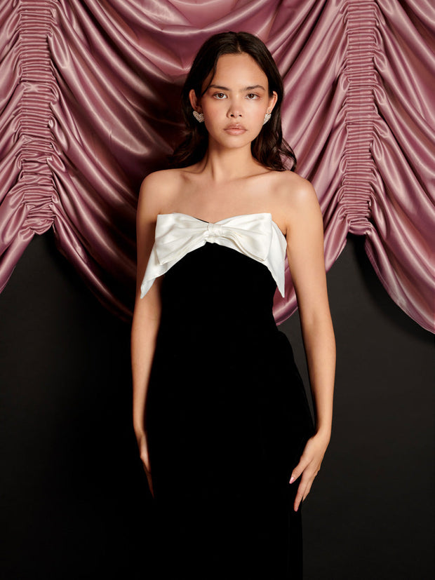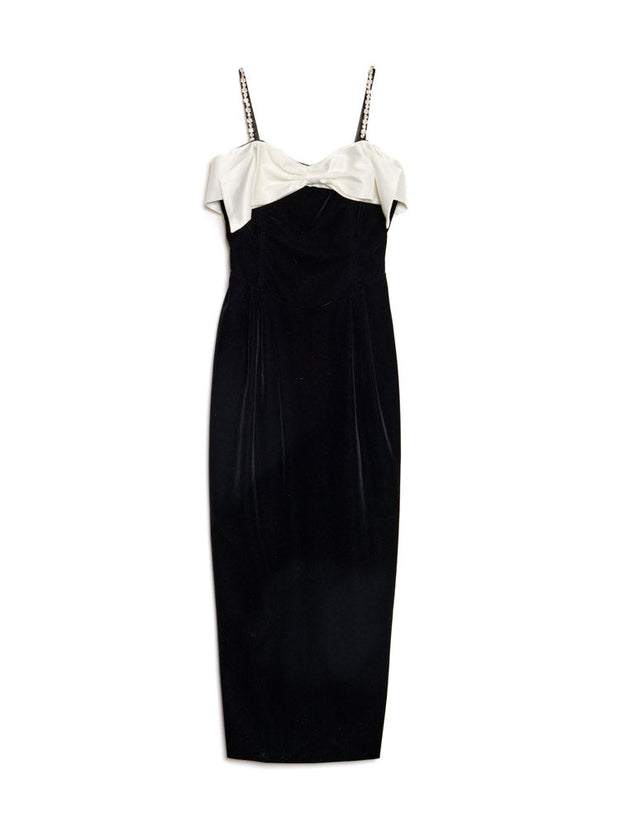 柔らかなベルベット生地のミディ丈ドレス。ネックラインにはコントラストのサテンリボンをあしらい、取り外し可能な宝石付きストラップ付き。裏地付きで隠しファスナー仕様。ドレス丈はサイズにより117.5~133.5cm。