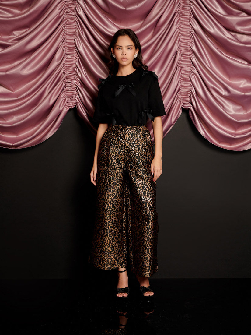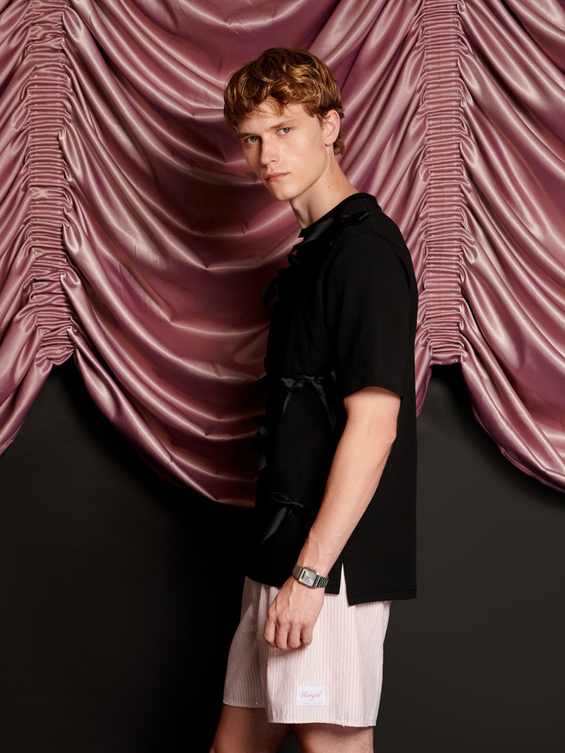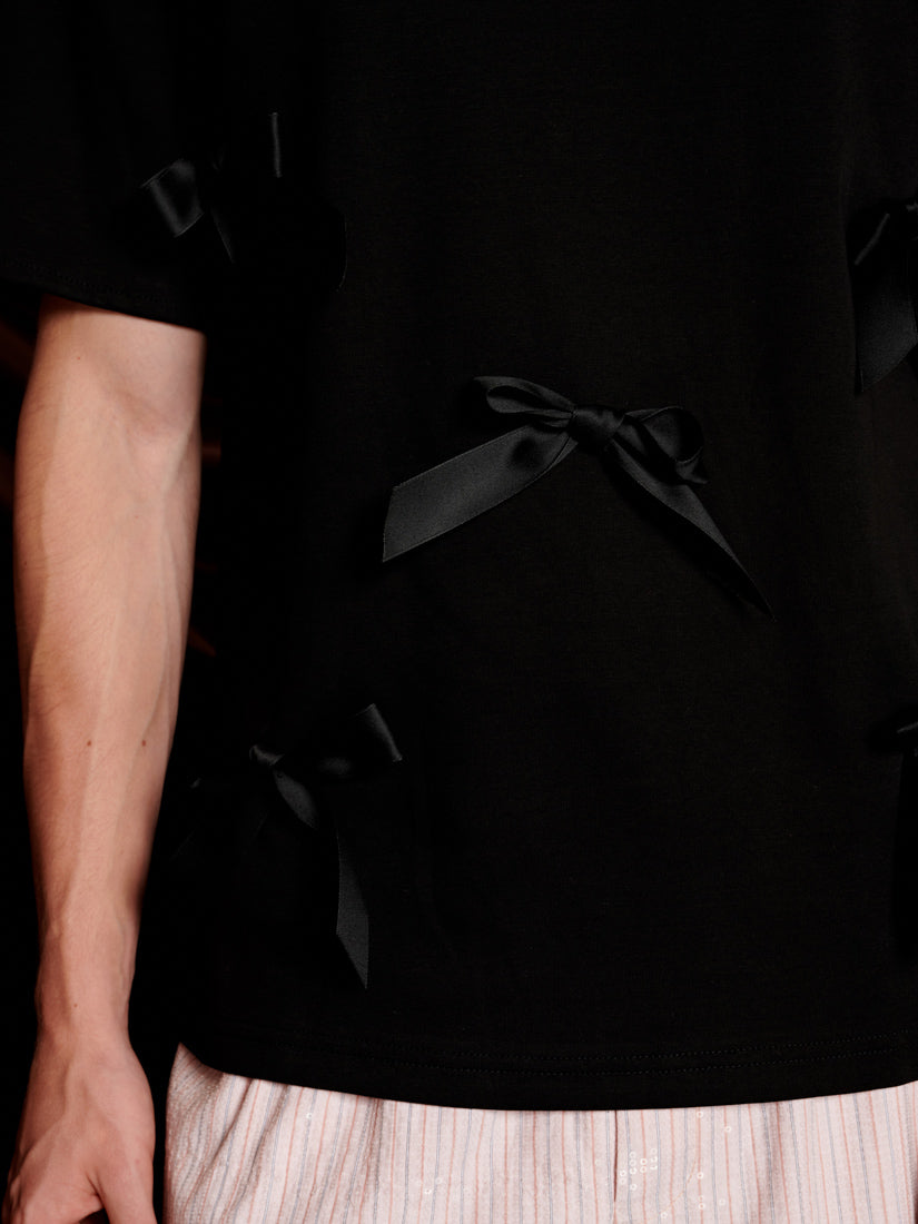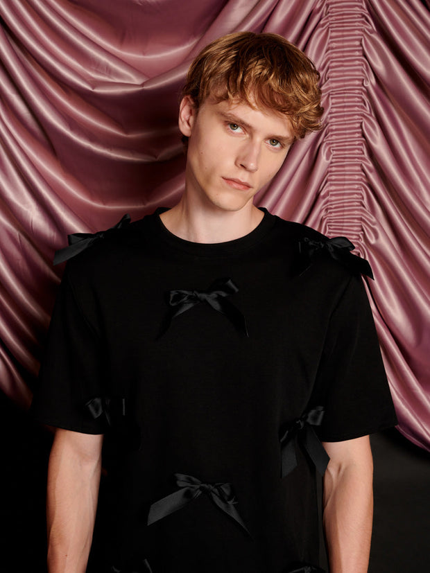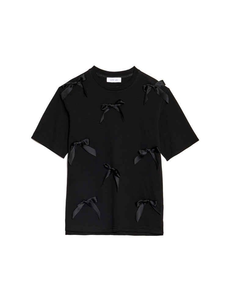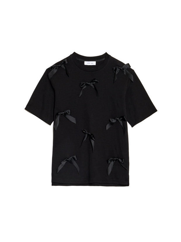 コットンジャージー生地を使用した半袖Tシャツ。マットサテンのリボン装飾が施されています。胸囲はサイズによって44.5〜57cmです。