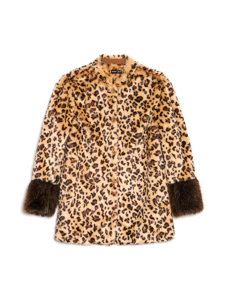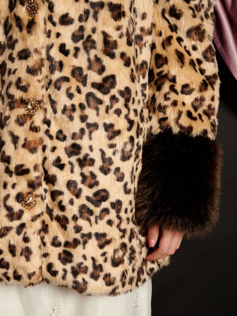 ミディアム丈のコート。レオパード柄のフェイクファー生地に、コントラストの効いた茶色のフェイクファーカフス付き。全面裏地仕様。サイドポケット付き。前面は宝石ボタンで留めるデザイン。