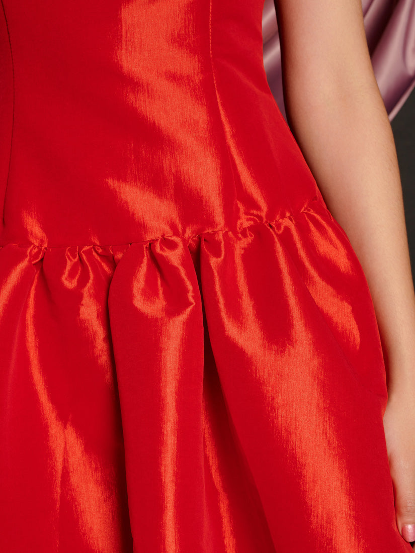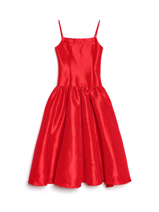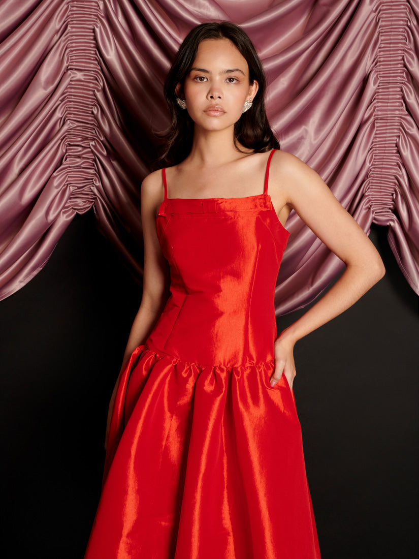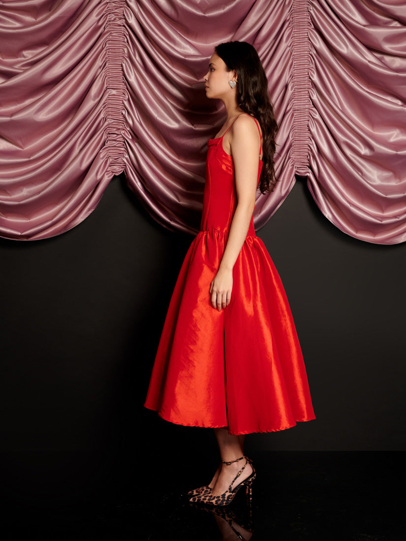 ハリのあるタフタ生地を使用したミディ丈ドレス。フィットしたボディスに、ギャザー入りのドロップウエストスカートを組み合わせたデザイン。ネックラインには固定されたリボンのディテールがあり、肩紐は調節可能なキャミストラップ仕様です。ドレスの着丈はサイズによって105〜111cmです。