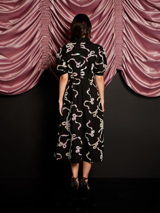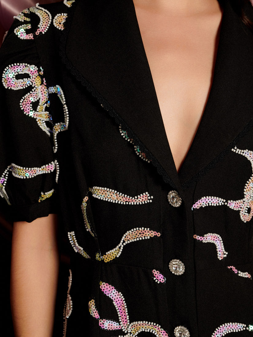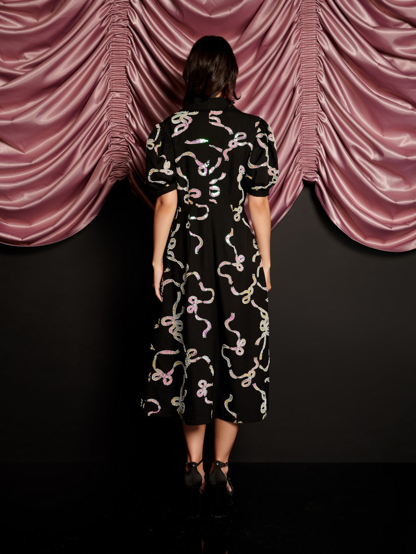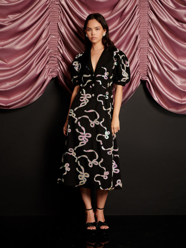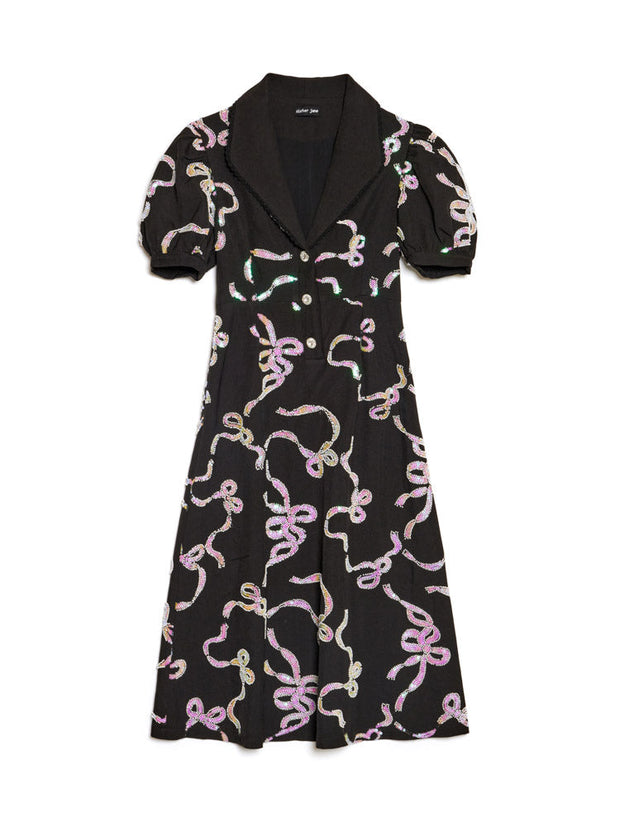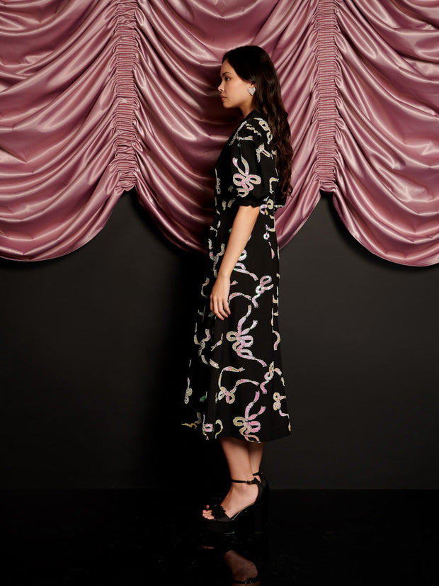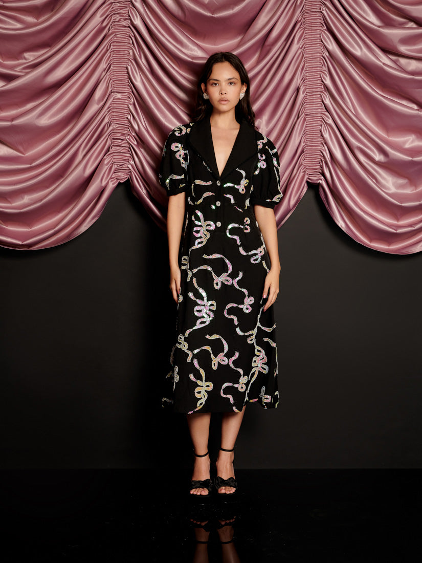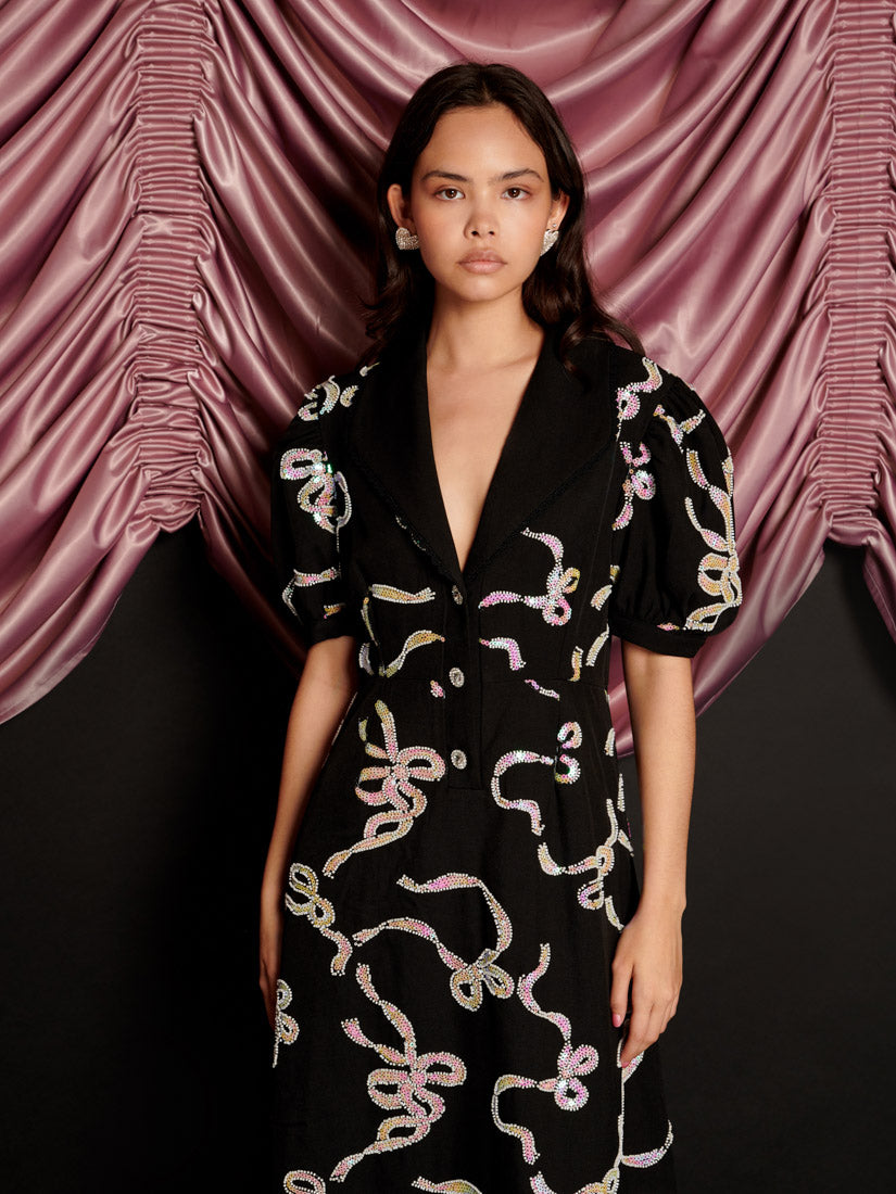 Ripple Bow Embellished ミディワンピースは、立体的な織地に踊るようにあしらわれたリボンのディテールが華やかさを放つ一着。フロントに並ぶジュエルボタンが、エレガンスをしっかりとキープします。