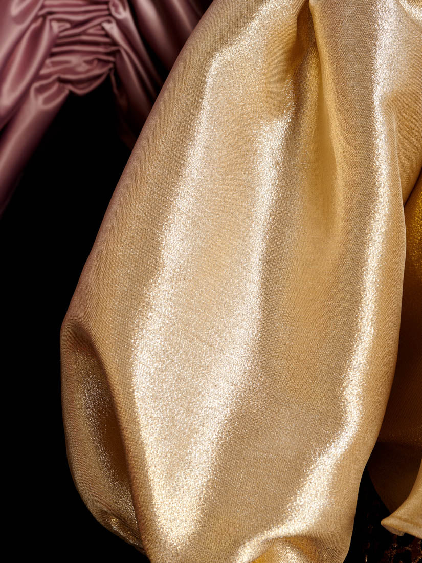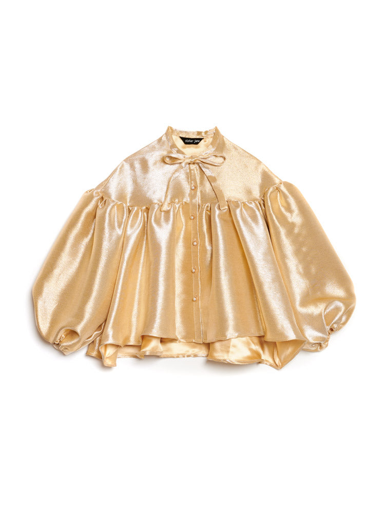 メタリックラメ生地を使用したルーズフィットブラウス。パールボタンと、首元にあしらわれた一体型のネックタイが特徴です。