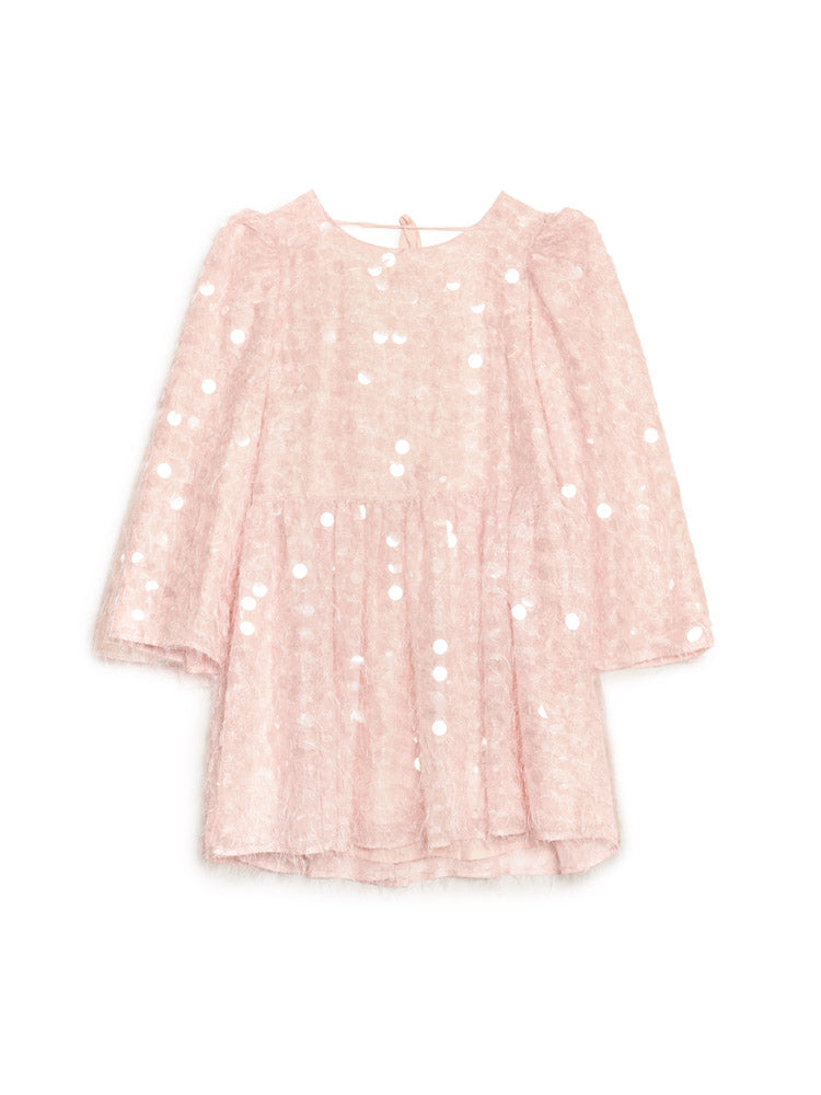 テクスチャードスパンコール生地を使用したルーズフィットのミニドレス。裏地付きで、背中が開いたデザイン。ネックラインの調節可能なタイで留められます。ドレスの着丈はサイズによって83〜89cmです。