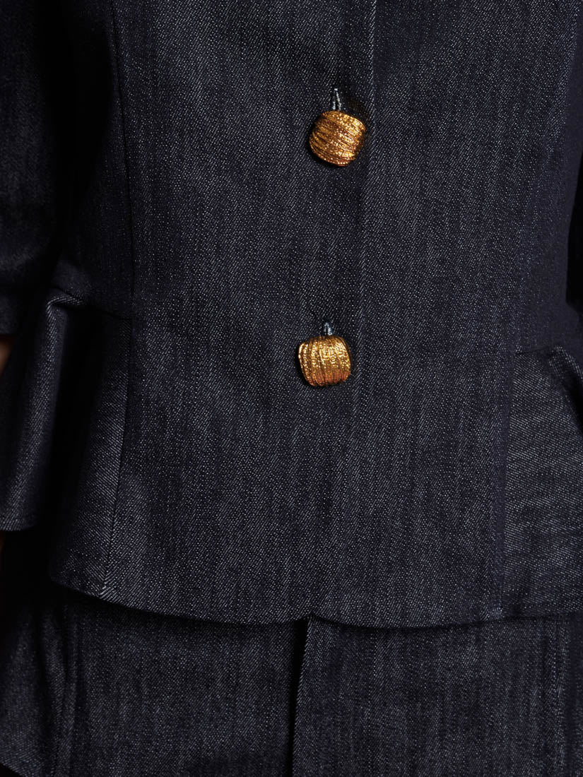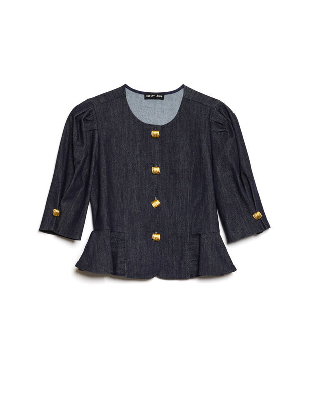 構造的なデニム生地のペプラムトップ。フリル付きのペプラムとプリーツディテールの半袖が特徴。存在感のあるゴールドボタンで留める。