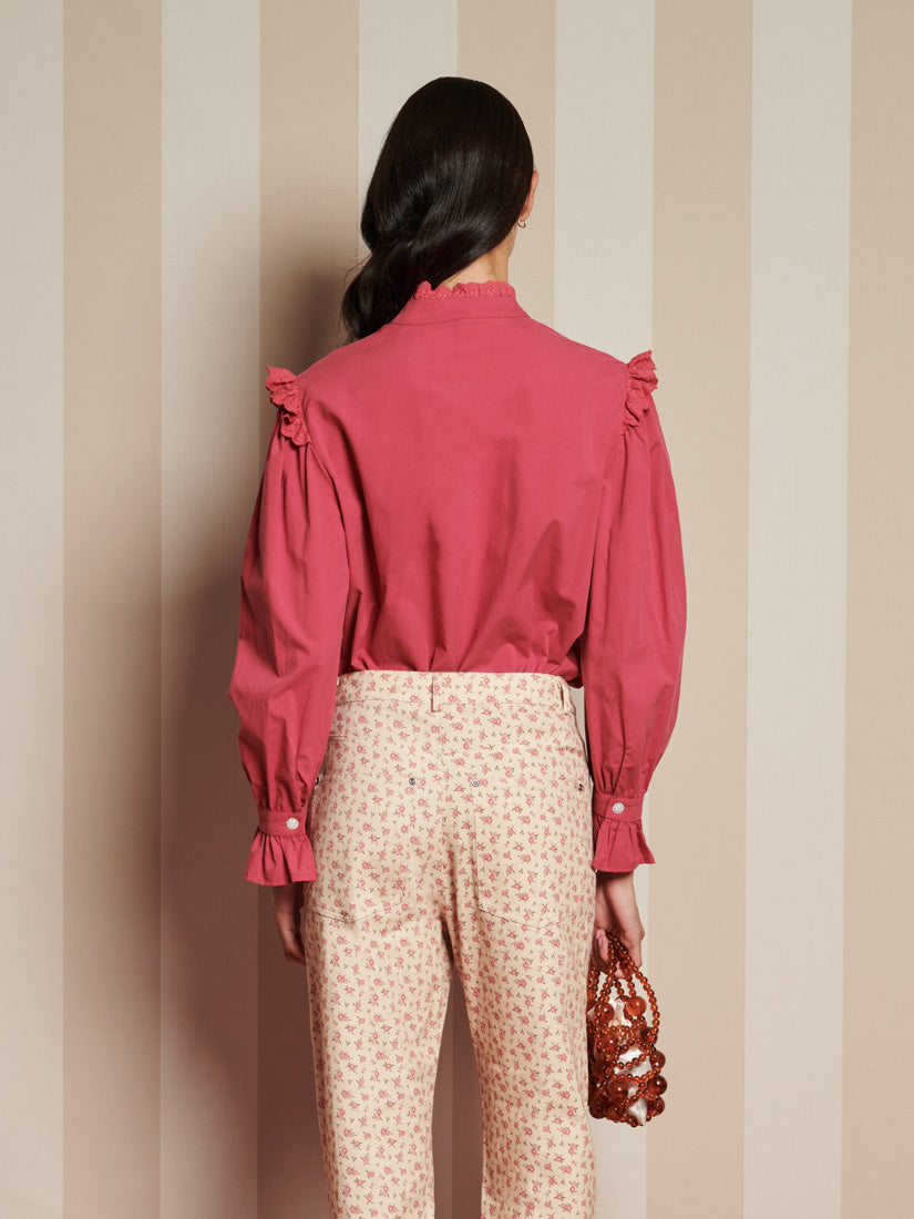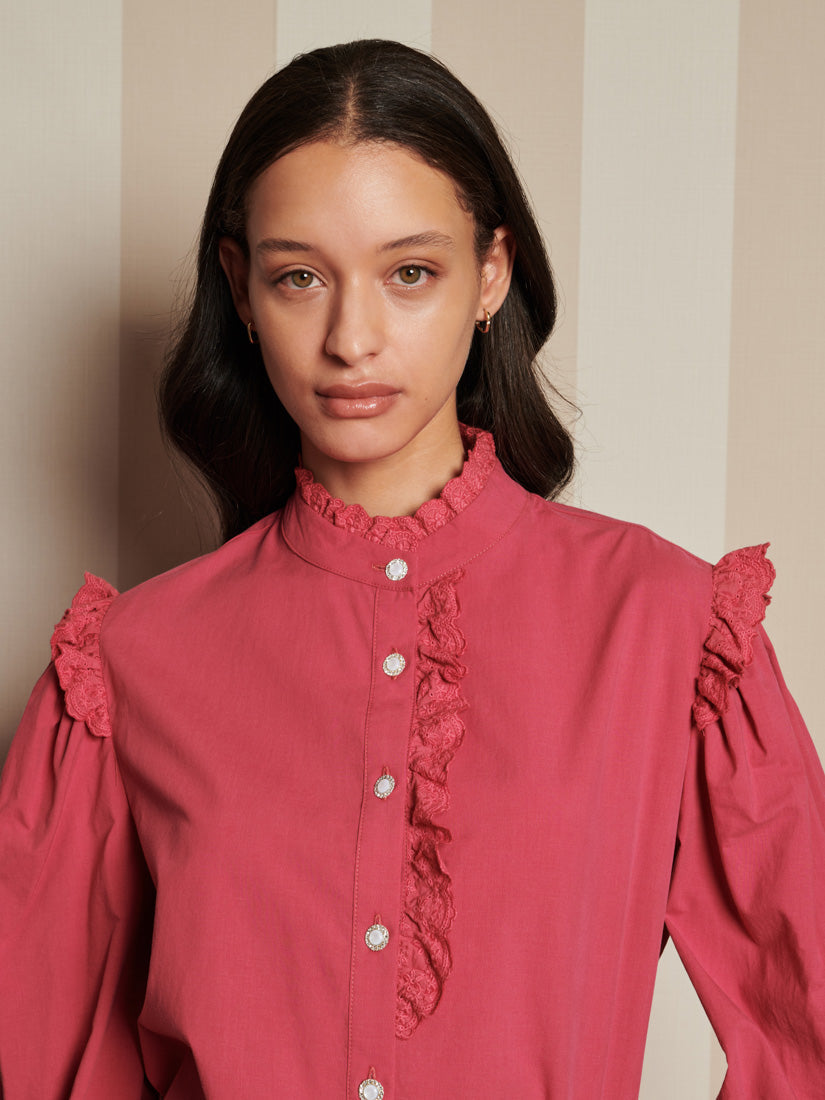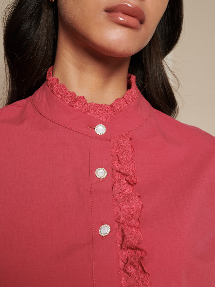 柔らかな織物を使用したボックスシルエットのブラウス。同系色のブロデリーアンジェーズの縁取りが施され、宝石と真珠のボタンで留める仕様。