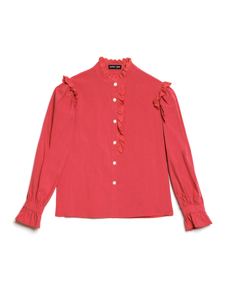 レースのようなトリムと宝石のボタンが特徴のFern Fare ブラウスは、遺産のリネンに施された繊細なディテールを思わせます。