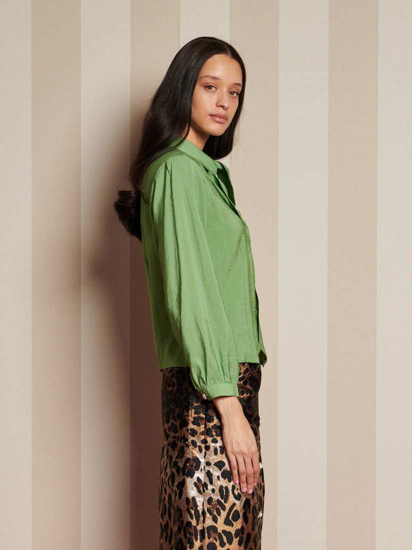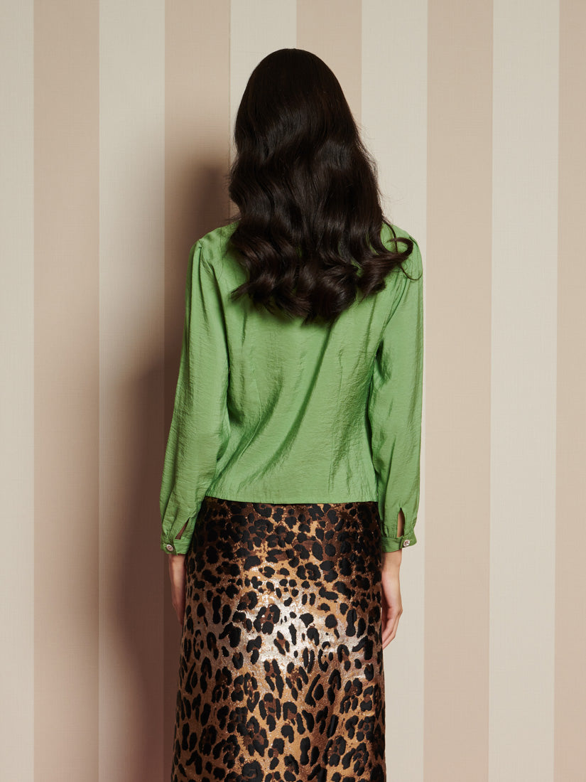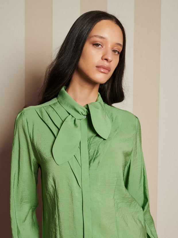 レギュラーフィットのブラウス。テクスチャー感のある織物素材を使用。首元には一体型のネクタイ風ディテールとV字型のフロントプリーツを施しています。前面には隠れたボタン留めを採用し、トップボタンには宝石をあしらっています。